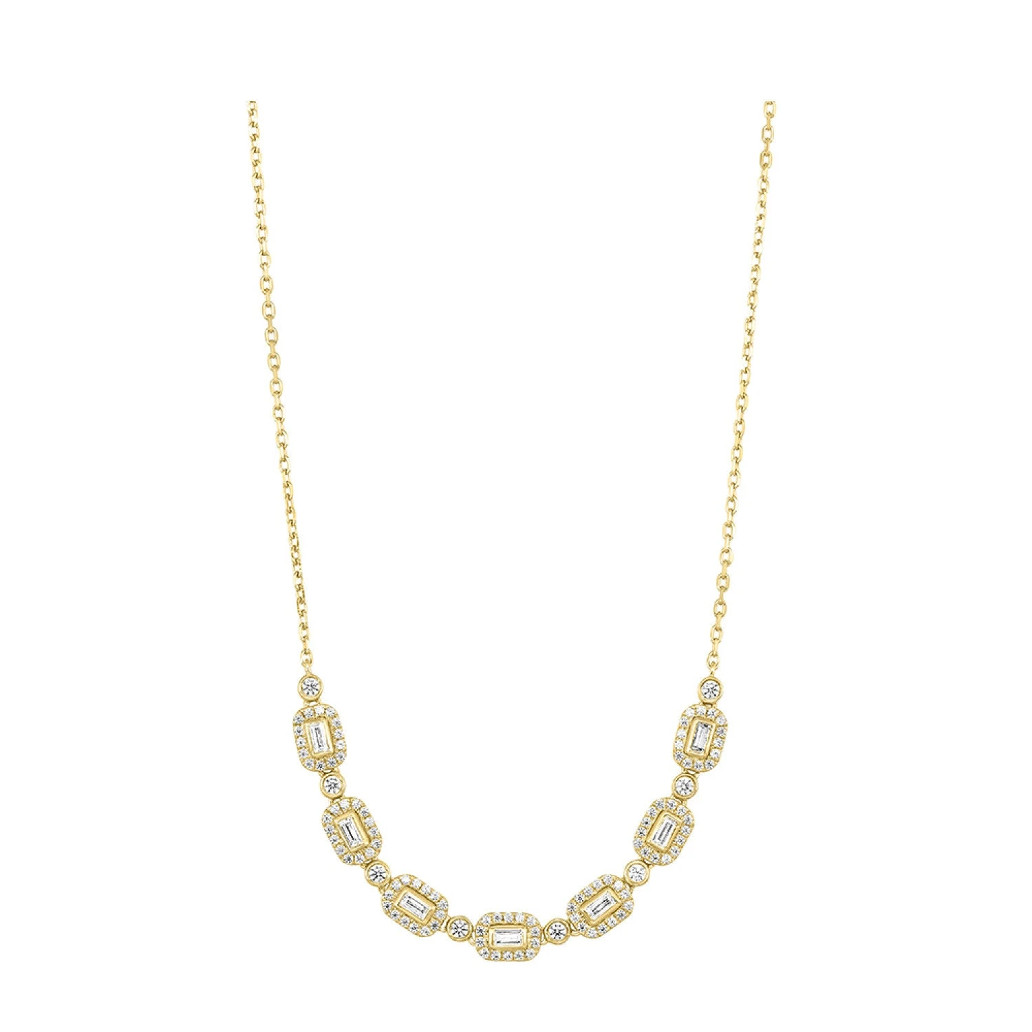 Make a bold statement with this beautiful station diamond fashion necklace. Seven Emerald cut diamonds are highlighted by round diamonds to give this necklace high impact.