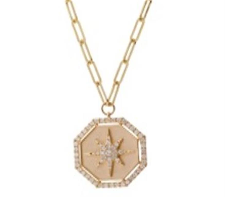 This polished yellow gold necklace emanates geometric grandeur. The contemporary paperclip chain perfectly complements the matte-finish octagonal medallion, crowned by a diamond star and encircled by sparkling gems, symbolizing spiritual clarity. Visit your local IDC for all your jewelry needs and trends.
