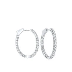 These show-stopping gold round hoop earrings display scintillating diamonds artfully arranged on the front and inside of each hoop, for a look of incredible style and elegance. Designed in brightly polished 14k white gold, these gorgeous 2 carat diamond hoops feature sparkling round brilliant cut diamonds prong set in an illusion eternity setting on both the front and inside. A hinge on the bottom and snap posts secure these remarkable diamond hoops. Diamond clarity is I2-I3 color H-K.