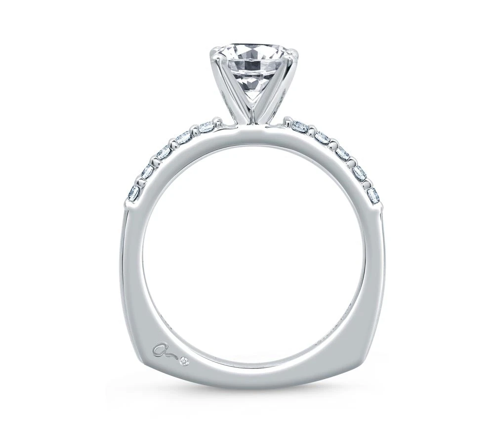 An A.JAFFE classic, this engagement ring is as timeless and everlasting as your love. Shared prong round brilliant diamonds run along either side of the shank, showcasing a touch of class and sophistication.