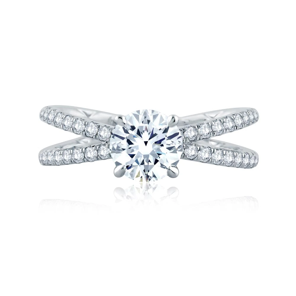 This engagement ring features a criss cross delicate French Pavé shank with a round center stone and quilted interior.