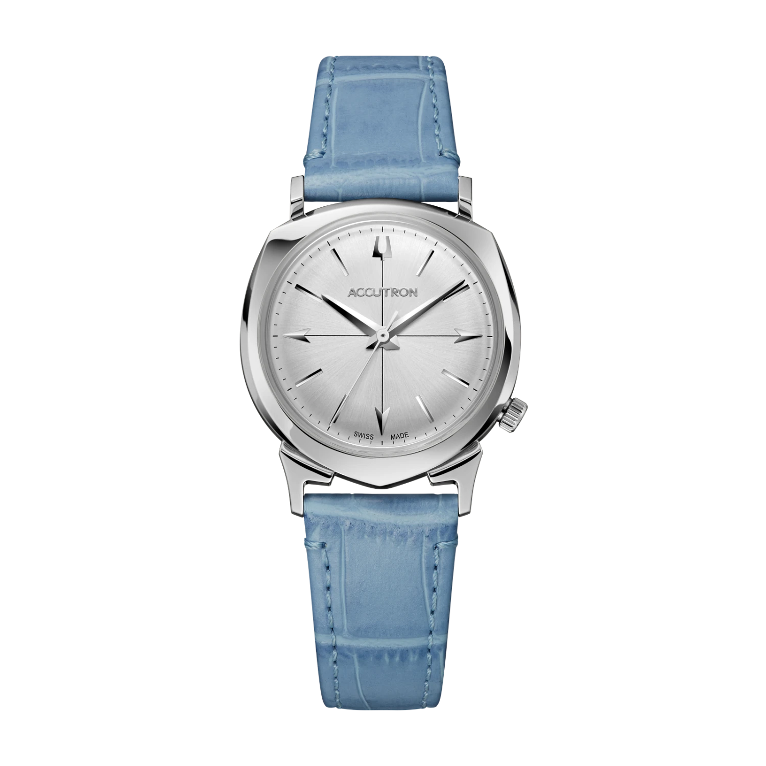 This watch has Accutron’s Swiss-made 26-jewel automatic movement. The Dial features 3-hand silver white dial with silver-tone applied hour markers. The Watch Case is Silver Tone Stainless steel case. The Watch Band is Periwinkle matt alligator grain strap with double-press deployant closure.