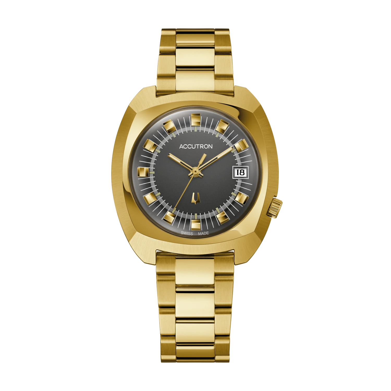 With a gold-tone stainless steel case and three-link bracelet with double-press closure, this Legacy collection timepiece from Accutron is a reimagining of the classic “261” from 1971. It features a unique cushion case design, a crown placement at 4 o’clock, a grey dial with sculptured and applied markers, and a calendar feature. Powered by Accutron’s Swiss-made 26-jewel movement, this classic luxury watch retains its original 38.5mm case diameter, giving it a timeless look that will look great on any wrist. Looking back while moving forward — this watch doesn’t believe we have to abandon the past to imagine a successful future.
