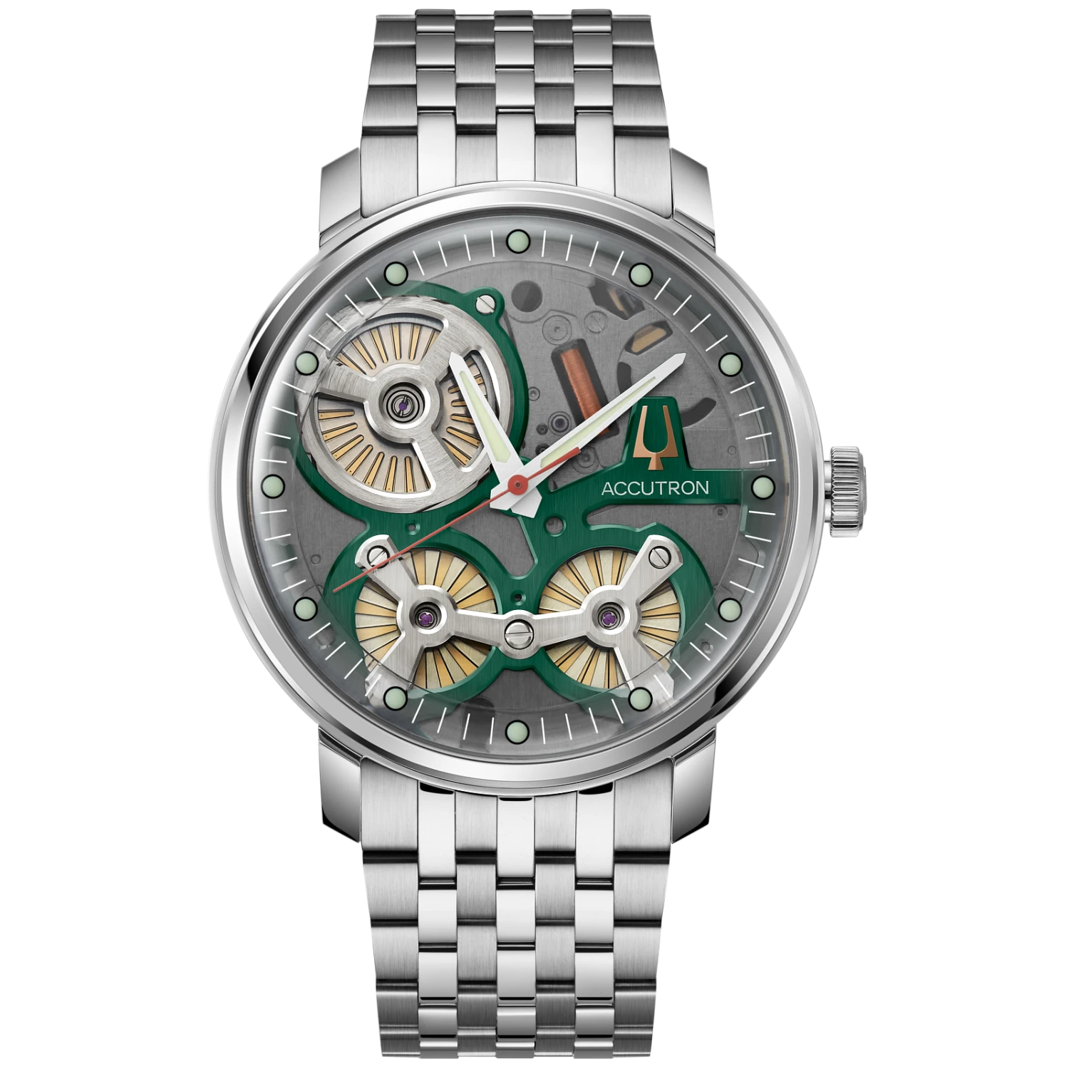 The Dial features Smoke grey open-work dial with signature Accutron green accents and transparent outer ring. Light green super luminous markers, white hour and minute hands and orange second hand. Stainless steel case and bezel with stamped Accutron logo and turbine design on the case back. The Watch Band is a Stainless steel bracelet with double-press deployant closure.