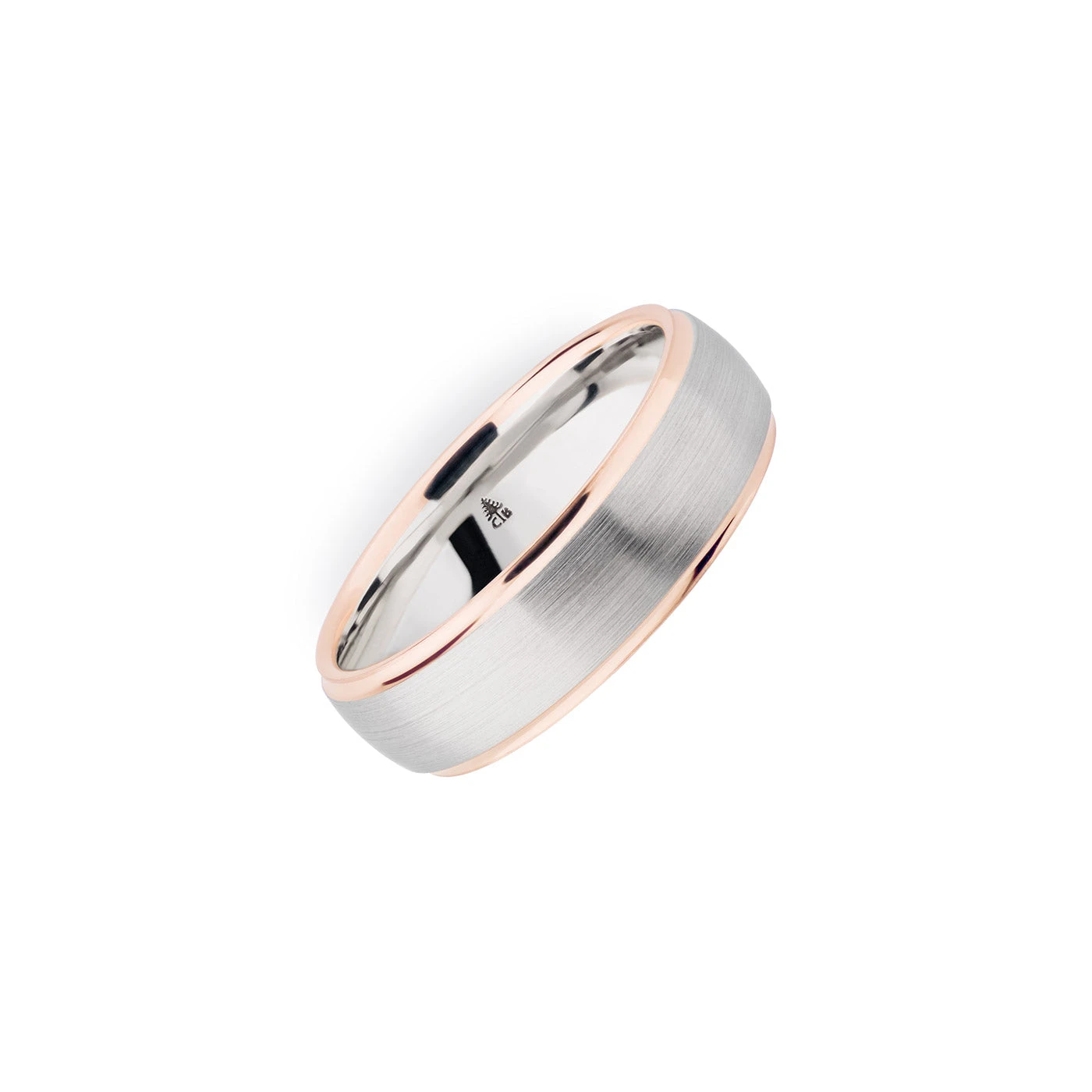 Heavy comfort fit palladium and red gold wedding band.