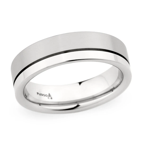 Modern satin finish wedding band with engraved stripe and polished edges.