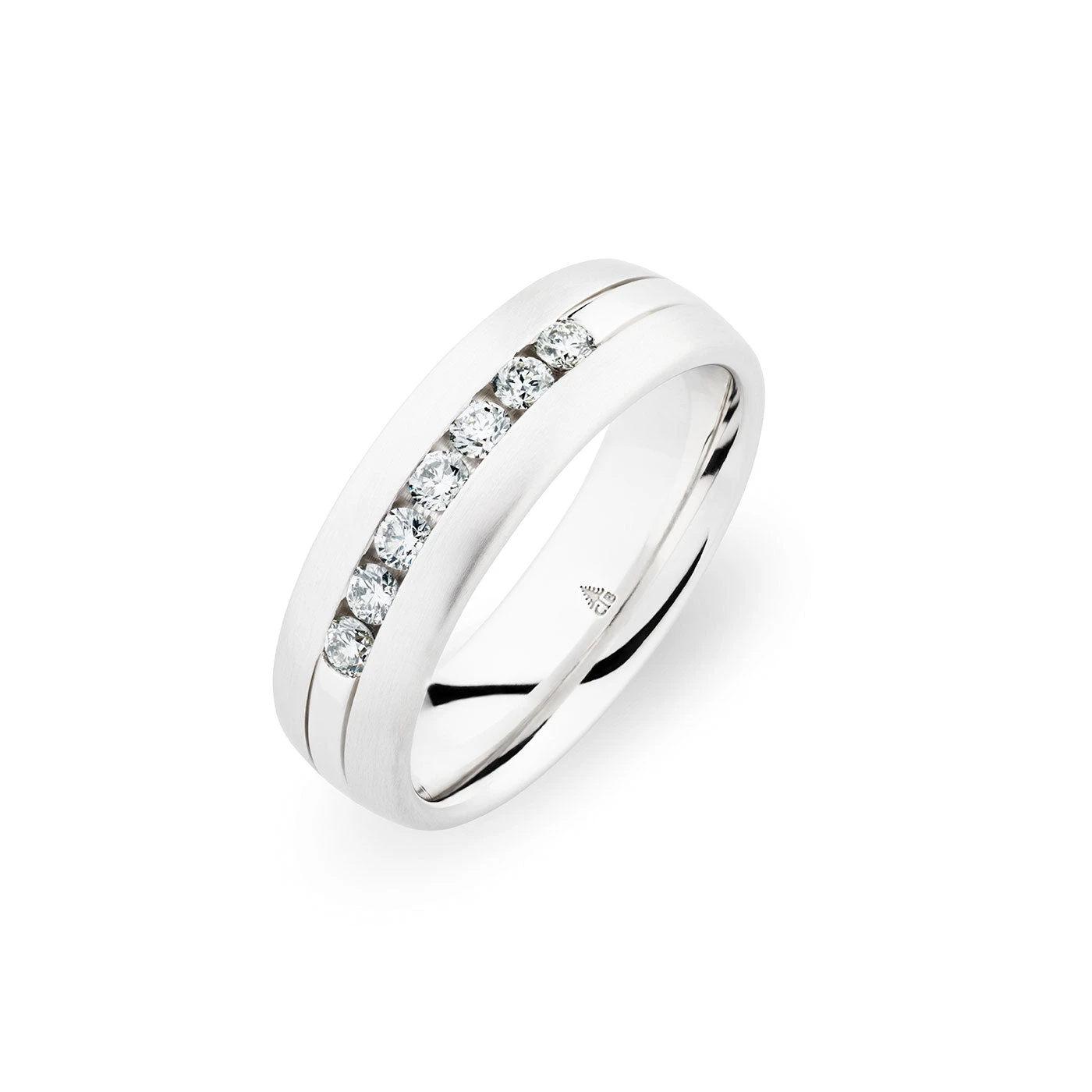 White gold comfort fit band with 7 round brilliant cut diamonds in the center.