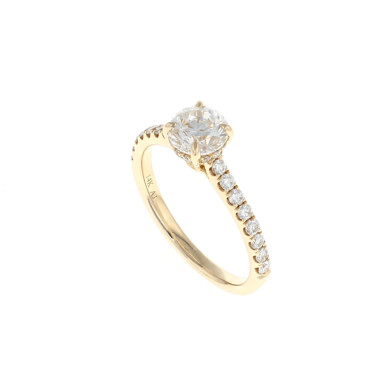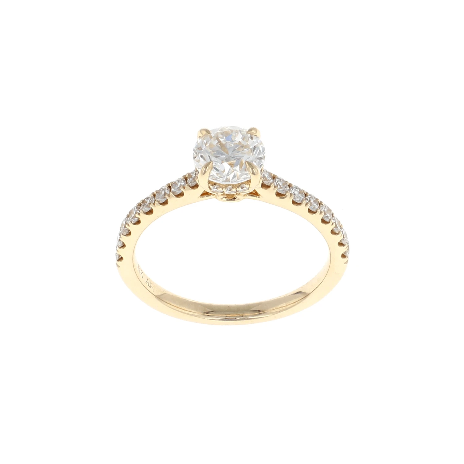 Outstanding Complete Engagement ring featuring a 1.00CTW Round center stone with a under diamond halo in a 14K Yellow gold setting.