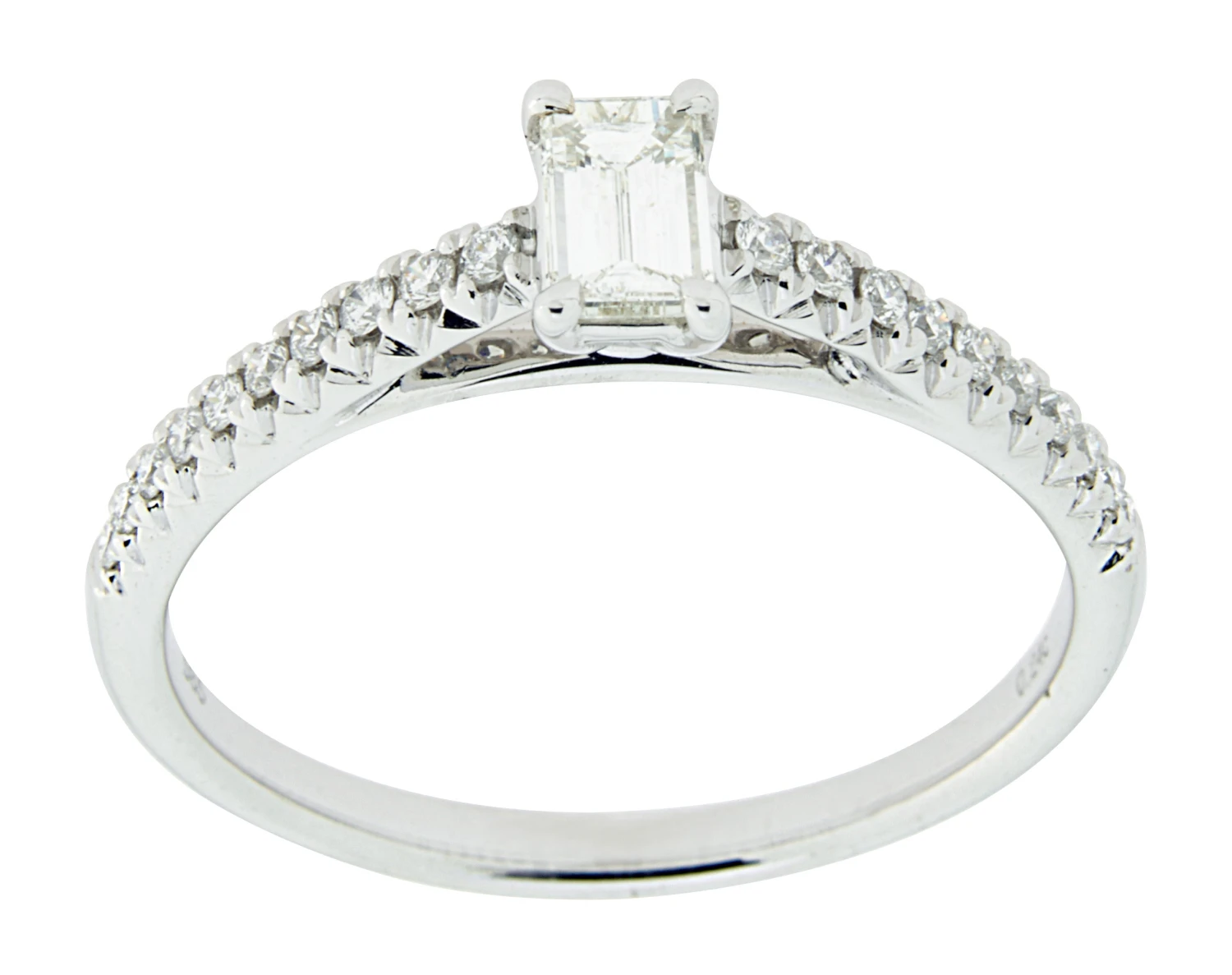 A divine 14kt white gold half-way pave diamond setting with approximately a 0.25 ctw emerald cut center diamond. Totaling 0.37 ctw.