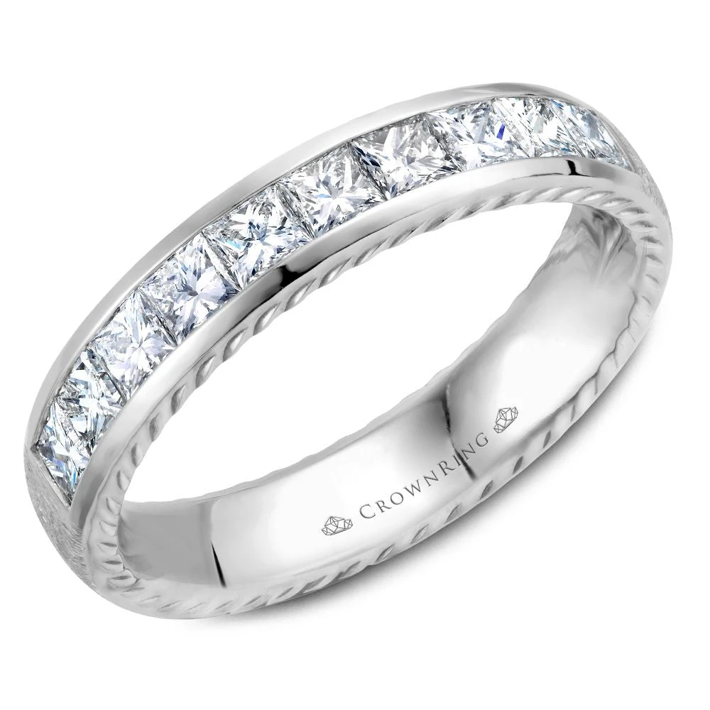 A wedding band with 10 princess cut diamonds and rope detailing on the sides.