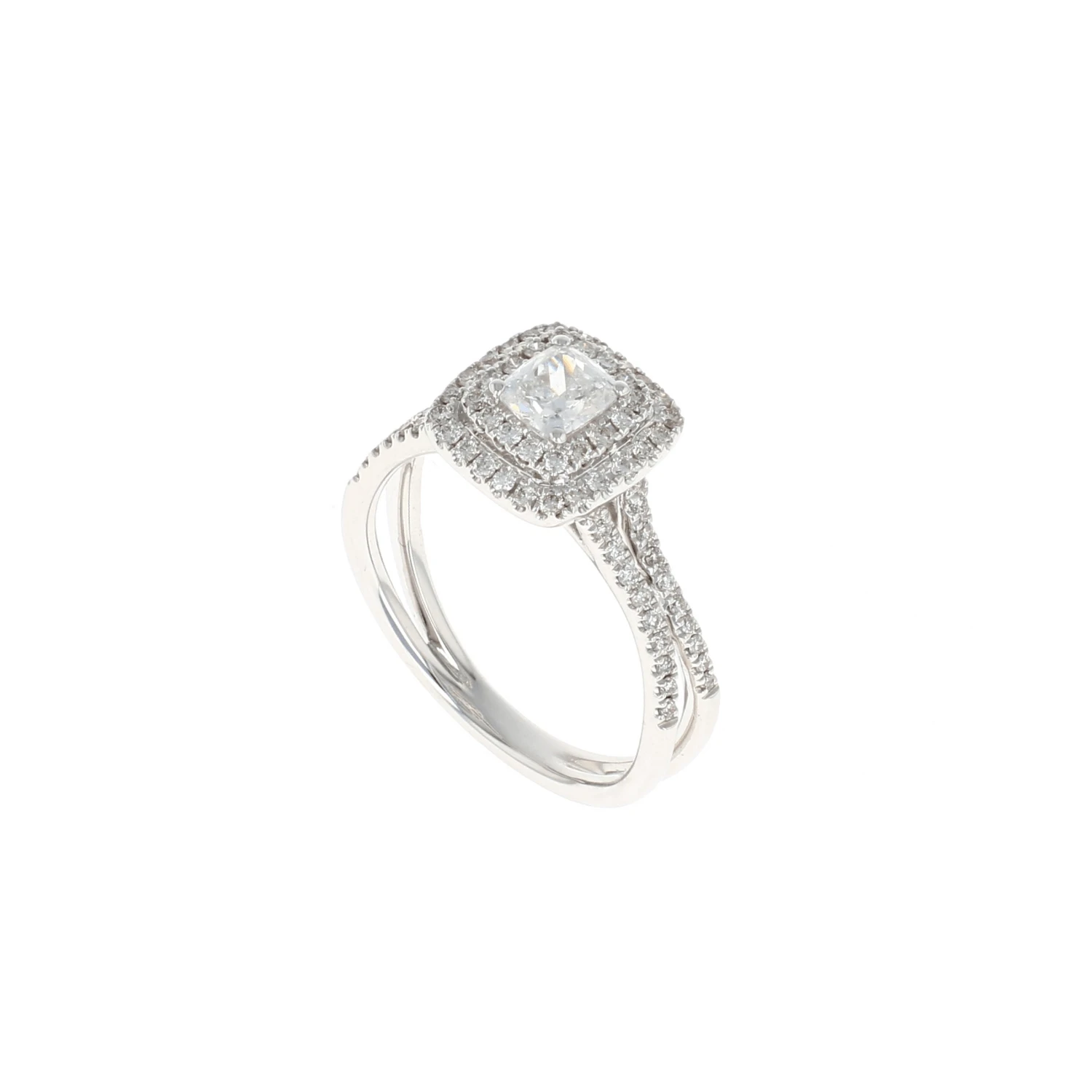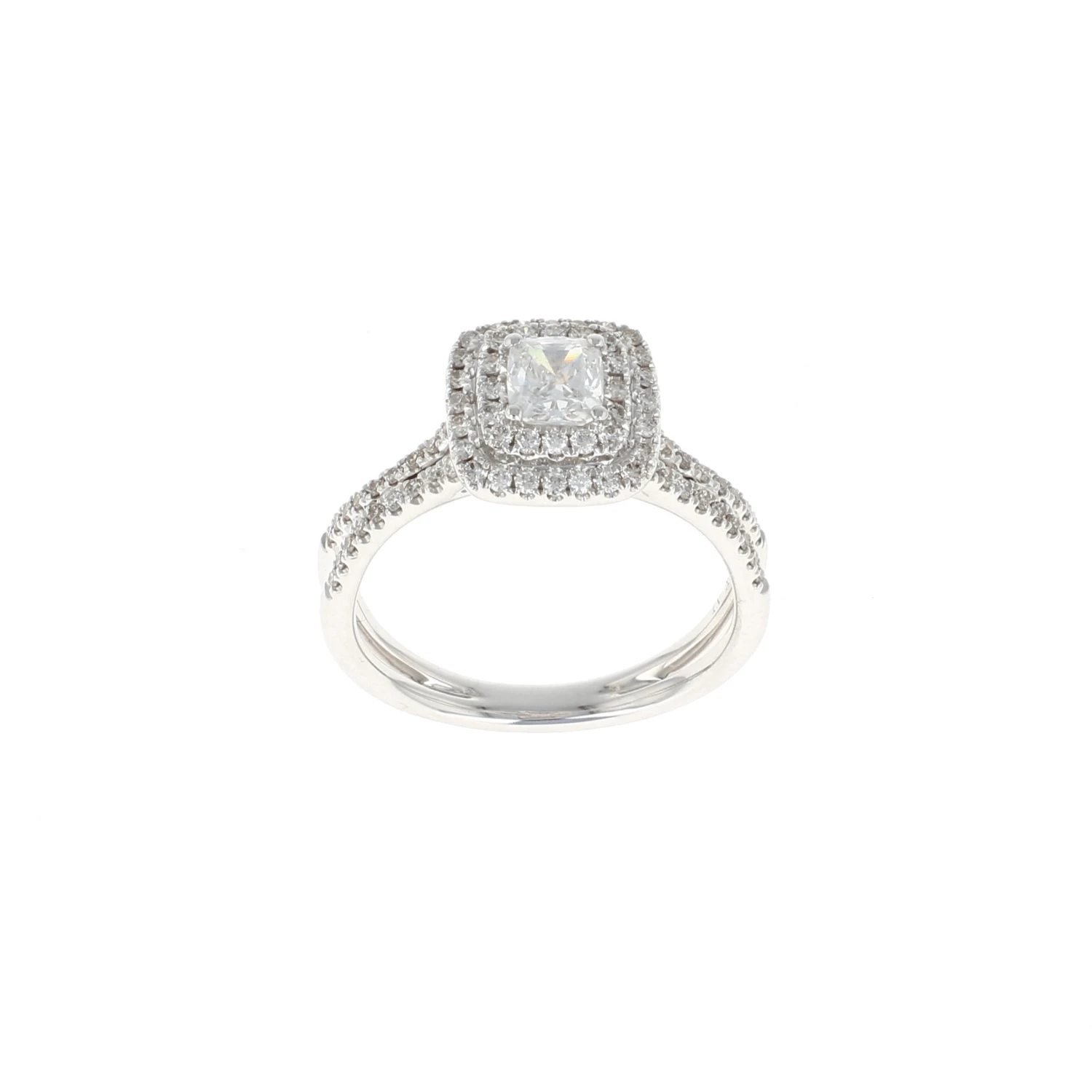 This complete engagement ring features a cushion center diamond with a cushion shaped halo highlighted with a 1/2 split shank semi mount set in 14K white gold. A beautiful way to say, “Will you marry me?”