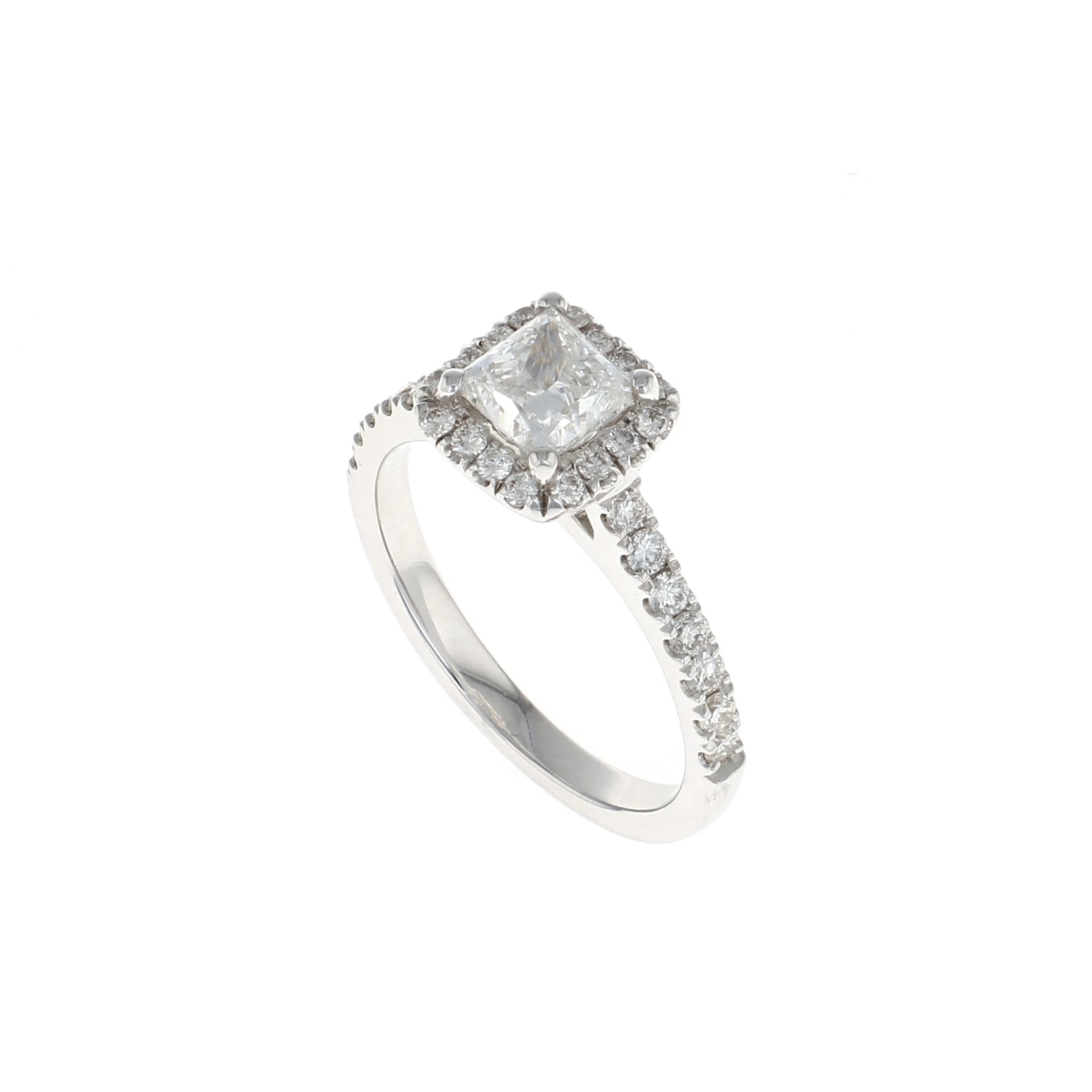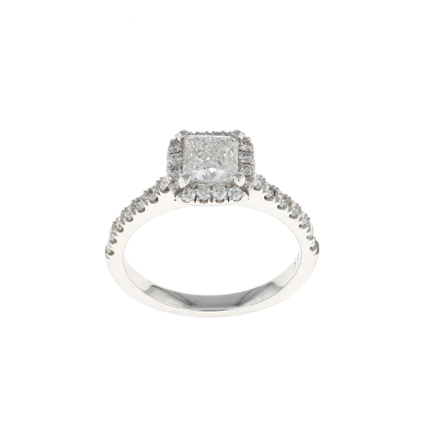 This complete engagement ring features a 1.01CTW center diamond with a cushion shaped halo highlighted with a 1/2 way semi mount set in 14K white gold. A beautiful way to say, “Will you marry me?”