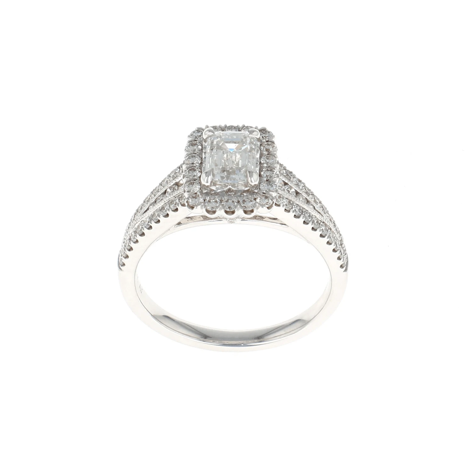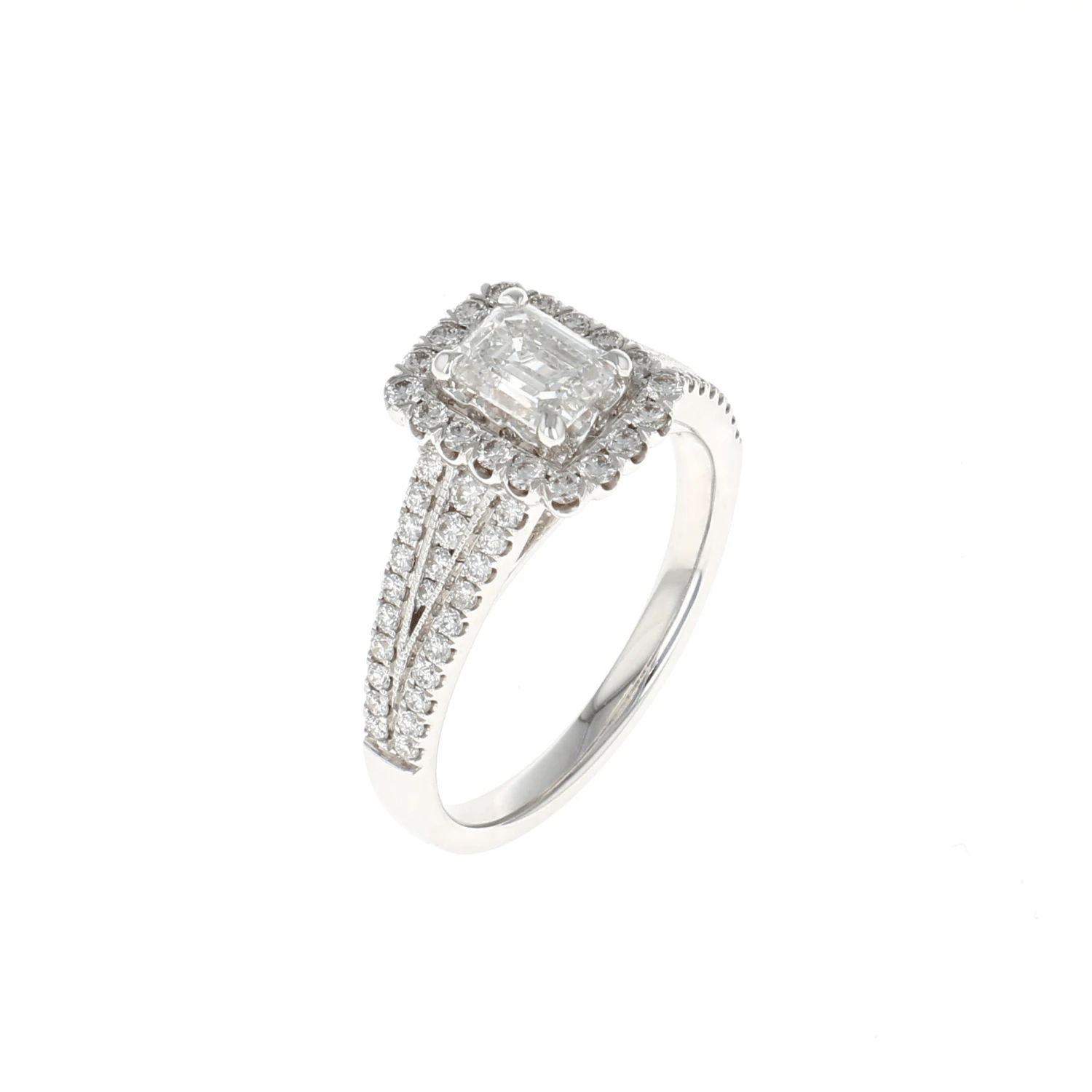 This beautiful Emerald Cut Halo Complete engagement ring has a 0.74CTW center stone with a 1/2 way tapered split shank semi mount. What a beautiful way to ask, “Will you marry me?”