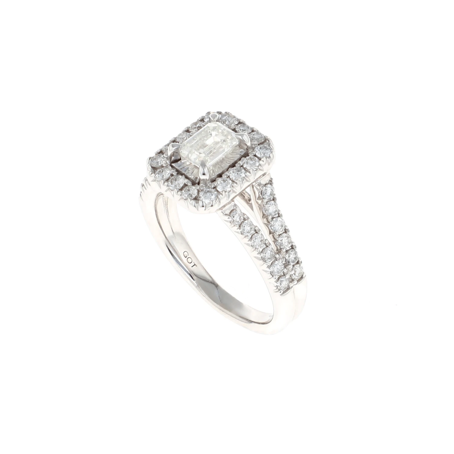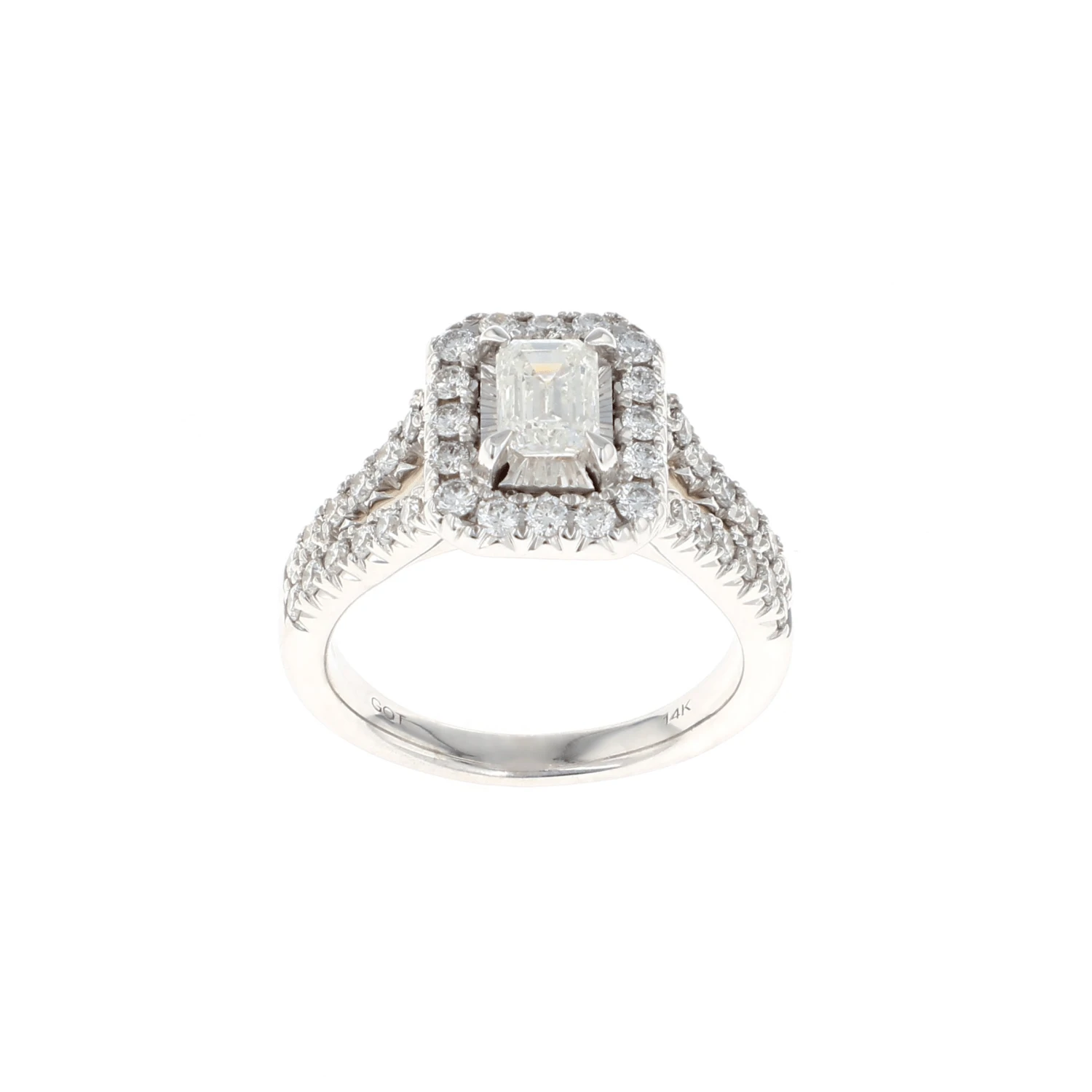This beautiful 0.75CTW Emerald Cut Halo Complete engagement ring has a 1/2 way pave split shank semi mount. What a beautiful way to ask, “Will you marry me?”