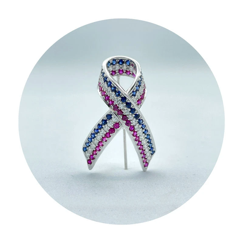 Estate 18K White Gold Diamond, Sapphire & Ruby Liberty Ribbon Pin
