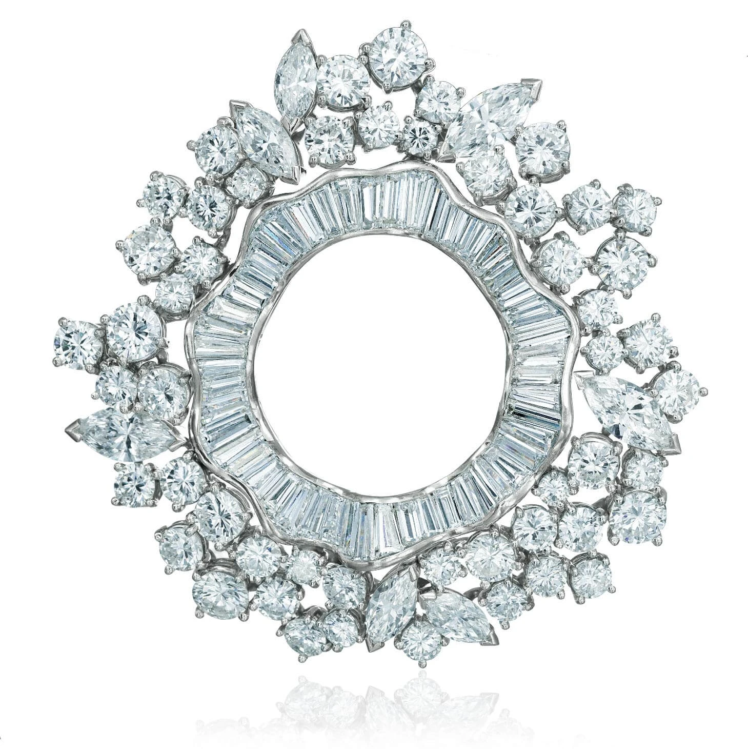 Be recognized for your sophisticated style with this one-of-a-kind Estate Platinum Fancy Diamond Circle Pin. Boasting 20CTW of impressive stones, this masterpiece is made from exquisite quality platinum and features an inner circle of perfectly matched baguette diamonds surrounded by an elegant mixture of round and marquise diamonds. Show off your boldness with this remarkable piece—it’s an absolute show stopper!