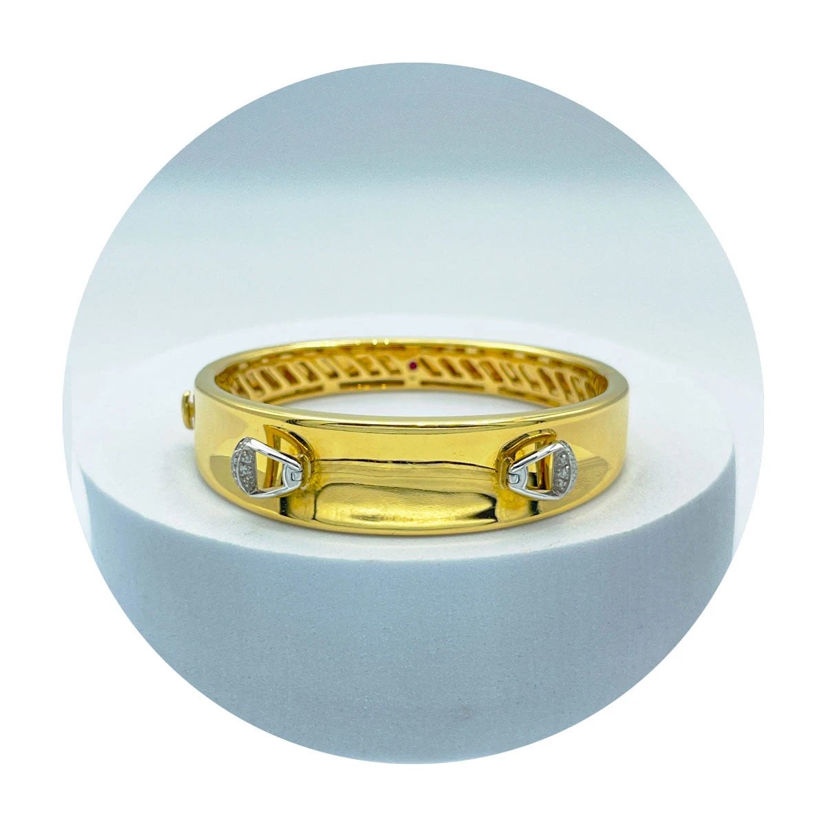 This authentic Roberto Coin bangle features a luxurious 18K Yellow Gold hinged construction with a gleaming polished finish. It is further adorned with 0.10CTW diamond accents set in 18K white gold, boasting GH color and SI clarity. With its exemplary craftsmanship and timeless design, it is an exquisite addition to any fine jewelry collection.