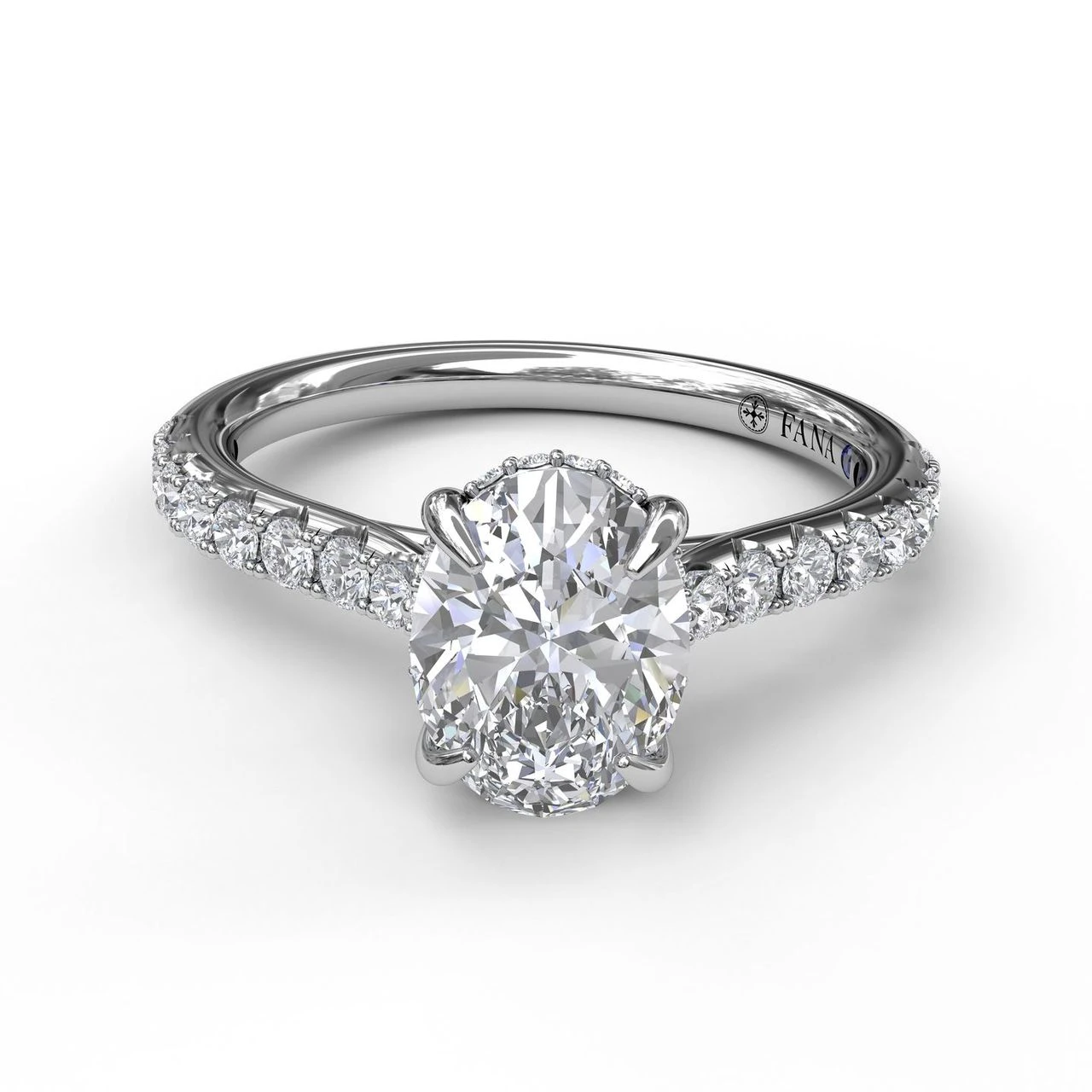 Classic and chic, this FANA engagement ring features a pave diamond shank and a hidden halo of diamonds embracing the center. This engagement ring is available in your choice of Platinum, White Yellow or Rose 18KT or 14KT gold and can be customized through IDC. Price shown is 14KT White Gold.