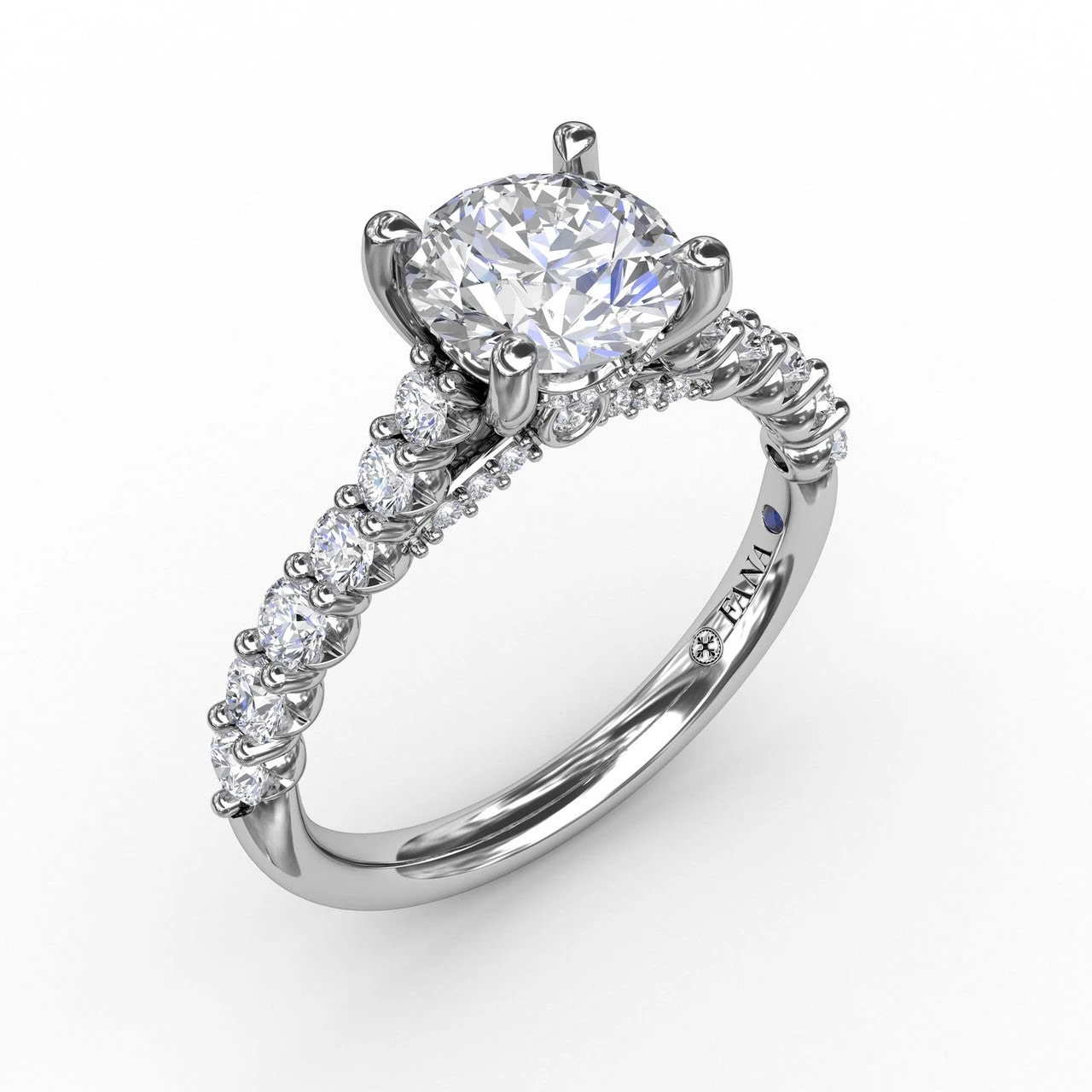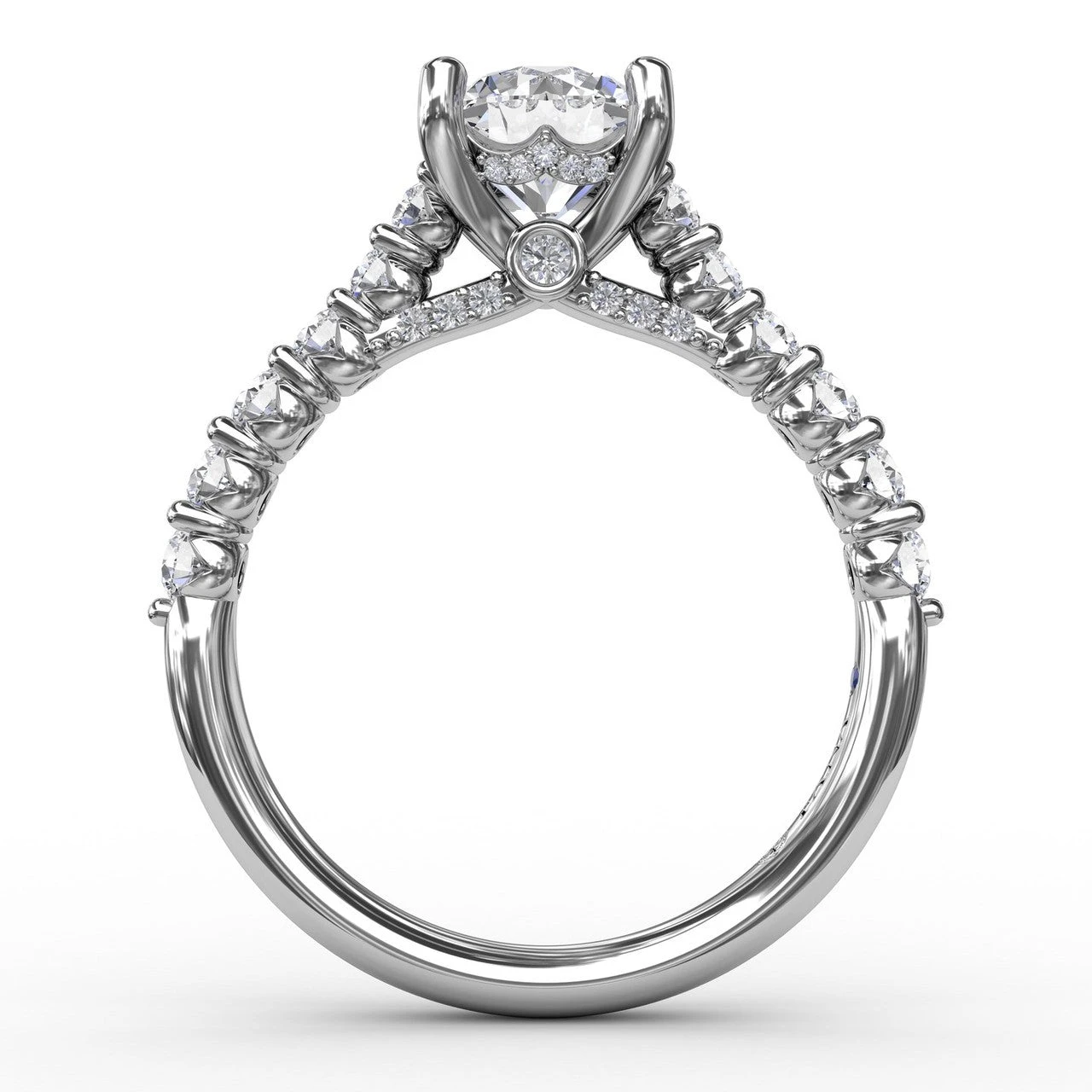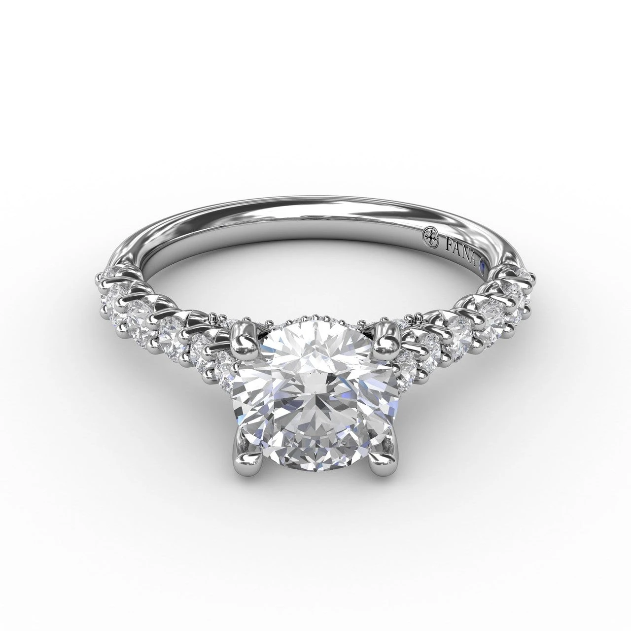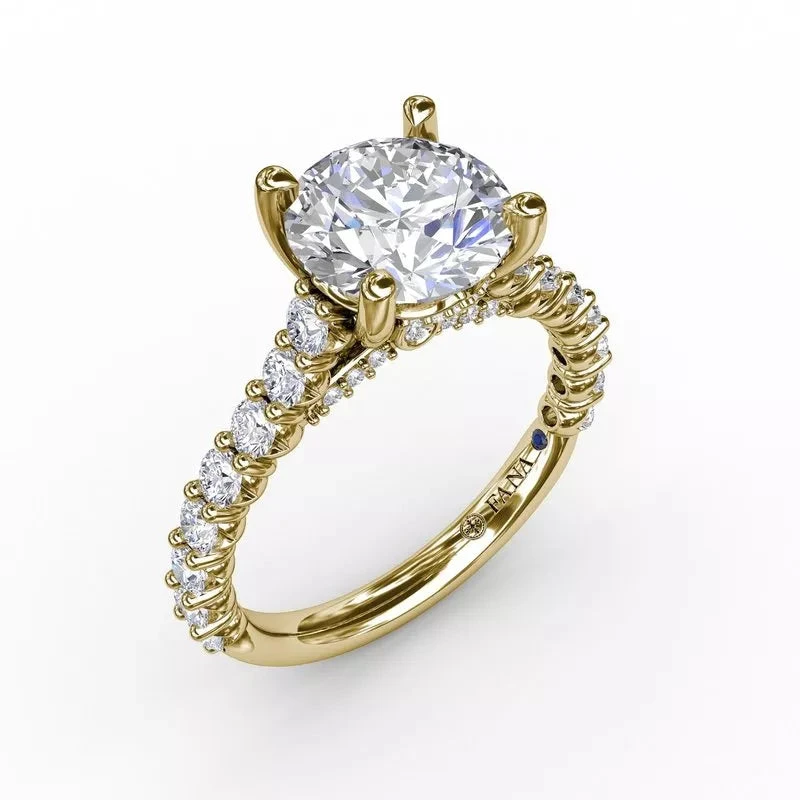 This detailed FANA engagement ring is available in Platinum, 18KT & 14KT White, Yellow or Rose gold.