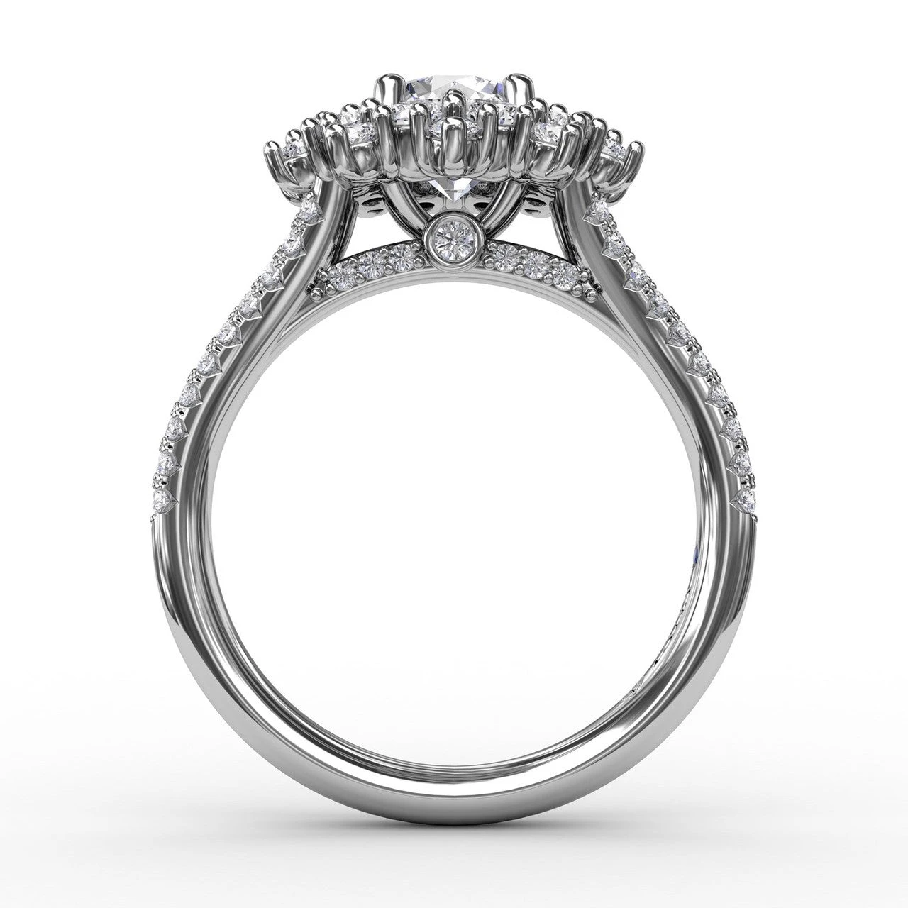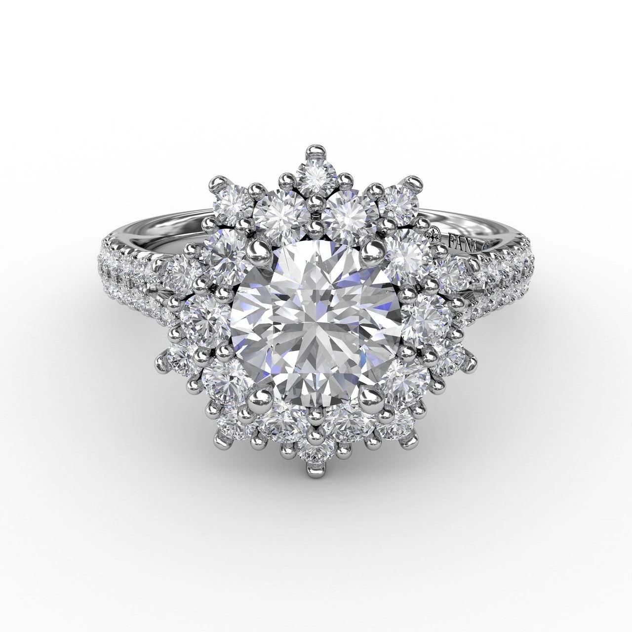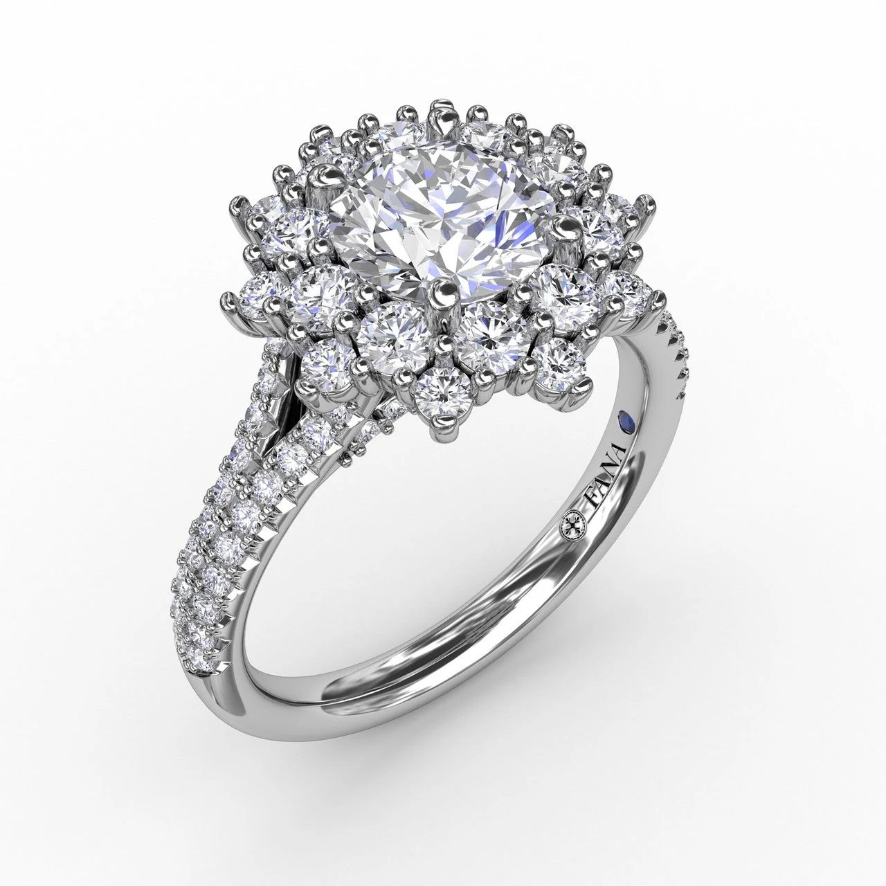 Sculptural, floral, fashion-forward: Bold metalwork borders all of the accent “petals” on this halo engagement ring. Our master craftsmen hand-pick the diamonds in an array of sizes to capture how a lush blossom might appear in nature. A double-row pavé diamond shank, with a narrow split up top, compliments this design’s rich, eye-catching details. This FANA engagement ring is available in your choice of Platinum, White Yellow or Rose 18KT or 14KT gold.