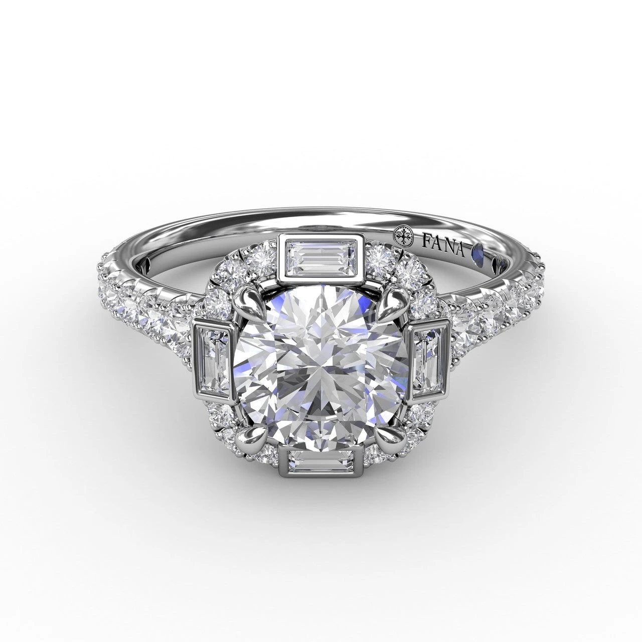 This Art Deco-inspired version of our popular cushion-shaped halo engagement ring features a clean, crisp arrangement of accent stones, including four bezel-set baguettes, and a trail of graduated round diamonds on the band.