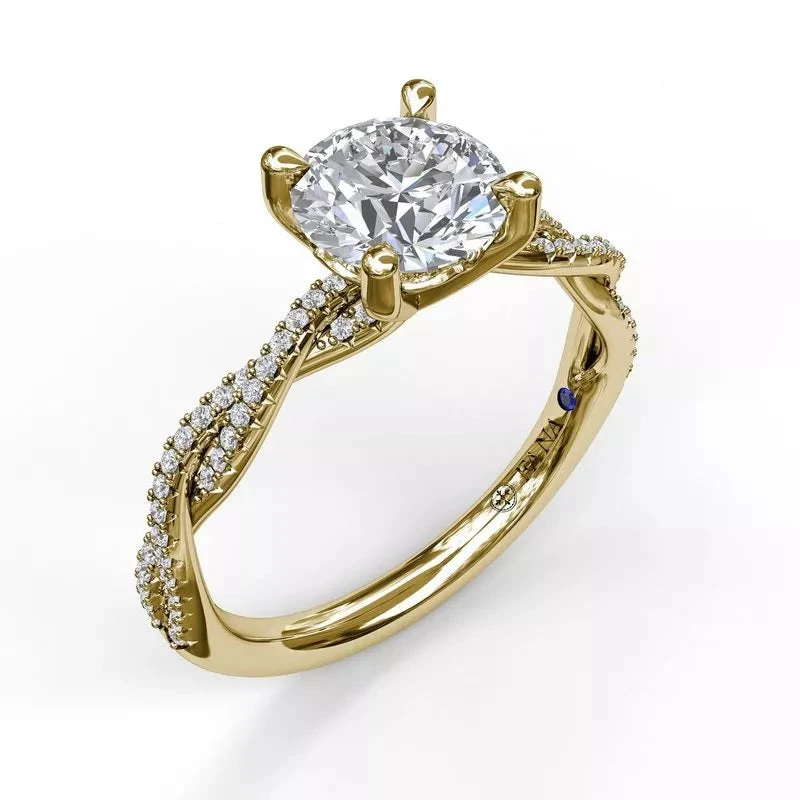Wondrous waves of gold and diamonds interlace to enhance the center stone of this dreamy engagement ring.