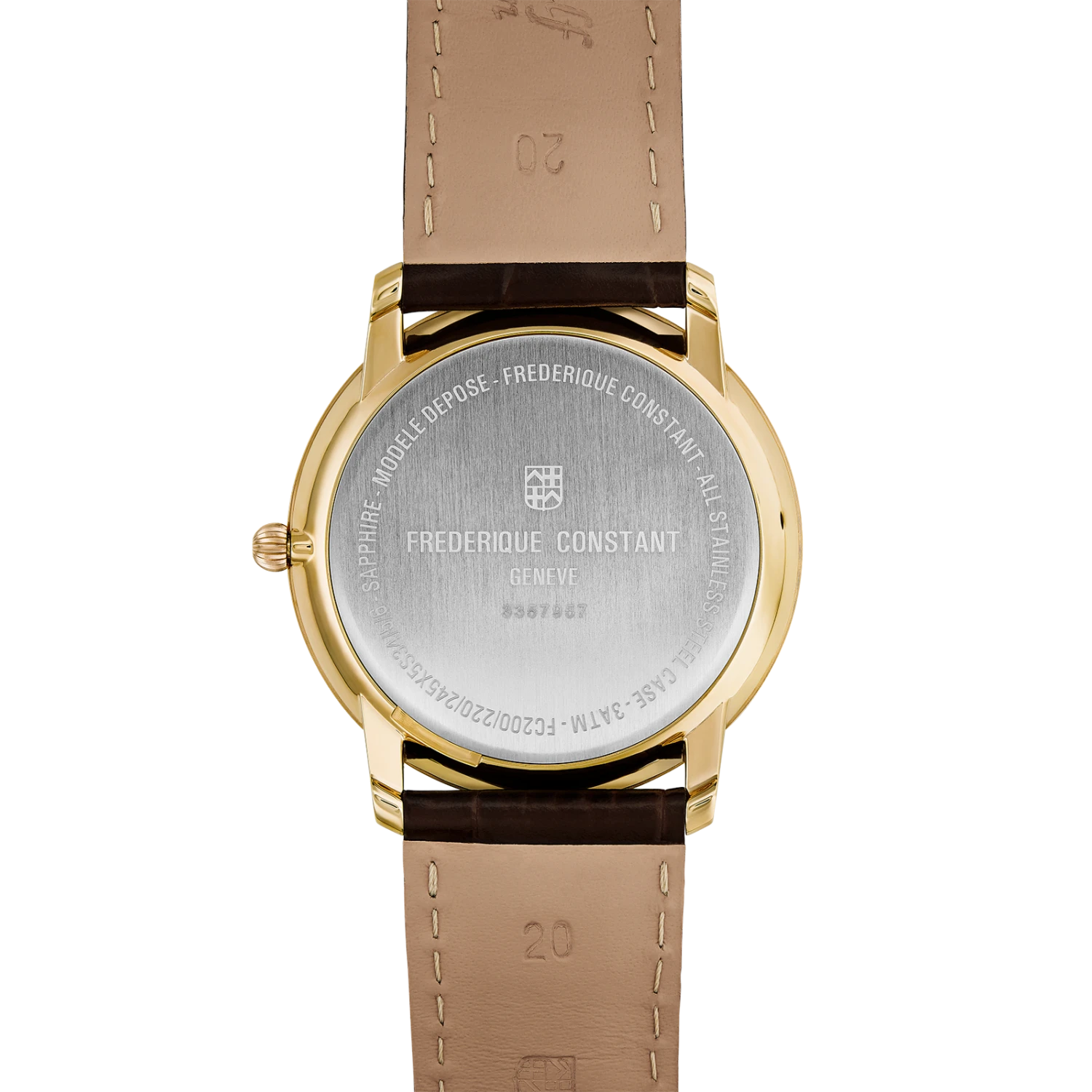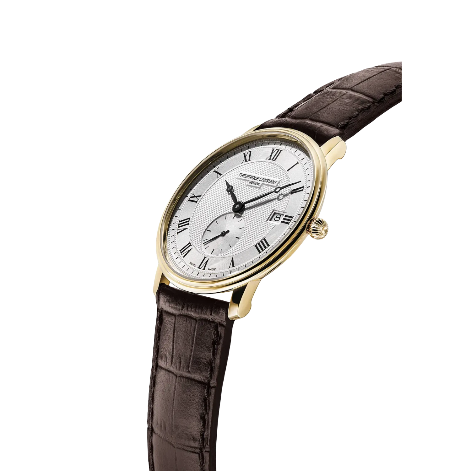 This Frederique Constant Mens Ultra Slim with a second date feature on dial is the epitome of class. Featuring a White face, Gold Plated case, and Roman Numerals, this watch is simple and sleek. A Brown leather strap finishes off this casual look.