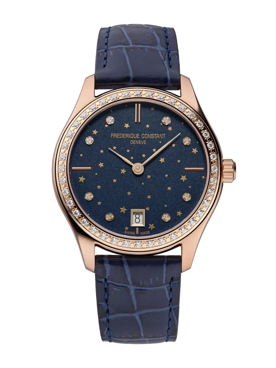 Classic and simple, this Frederique Constant timepiece features a Black dial with diamond hour markers and stars scattered across. The Black Calf leather with crocodile pattern embossing strap highlights the diamond bezel beautifully. It’s versatility will make you want to wear it every day!