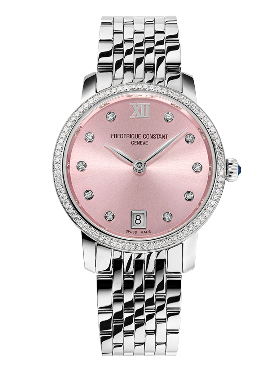 With a delicate 30mm diameter, the Classics Slimline Ladies has been designed to emphasize the soft curves of the wrist with harmony and sensitivity. Polished stainless steel 3-part case with 68 diamonds on the bezel and 10 diamond indexes. The pink dial with sunray finishing make this timepiece stand out with grace and elegance.