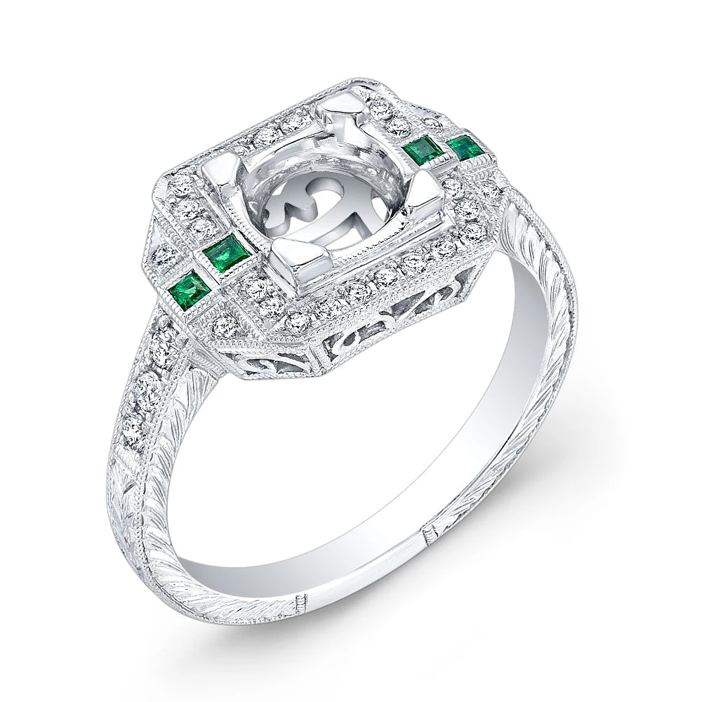 Engraved Antique Style Engagement Ring, Set with Diamonds and Custom Cut Emerald . Available in many other gemstone colors. All of Jolie Designs Styles can be customized to take nearly any center stone size or shape.