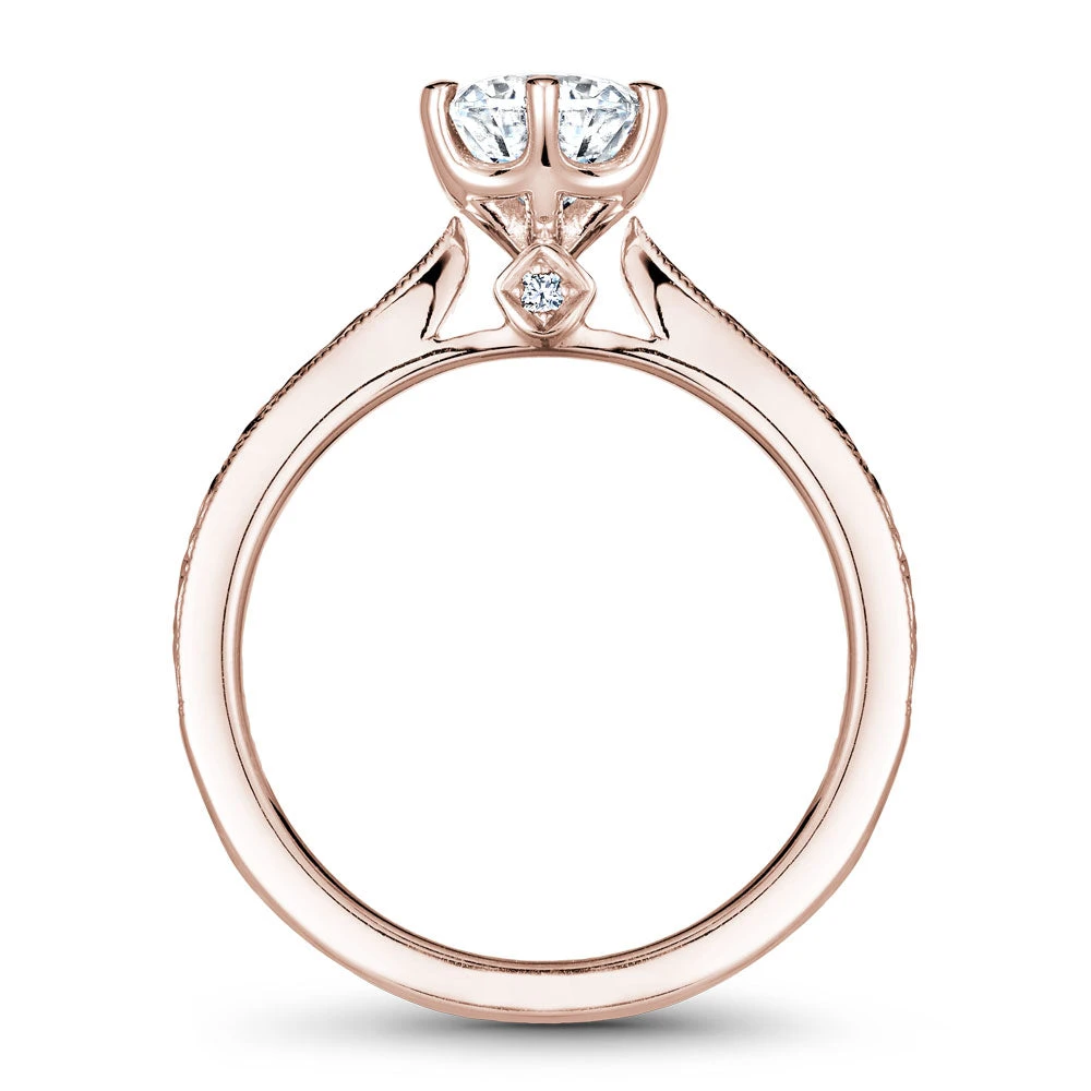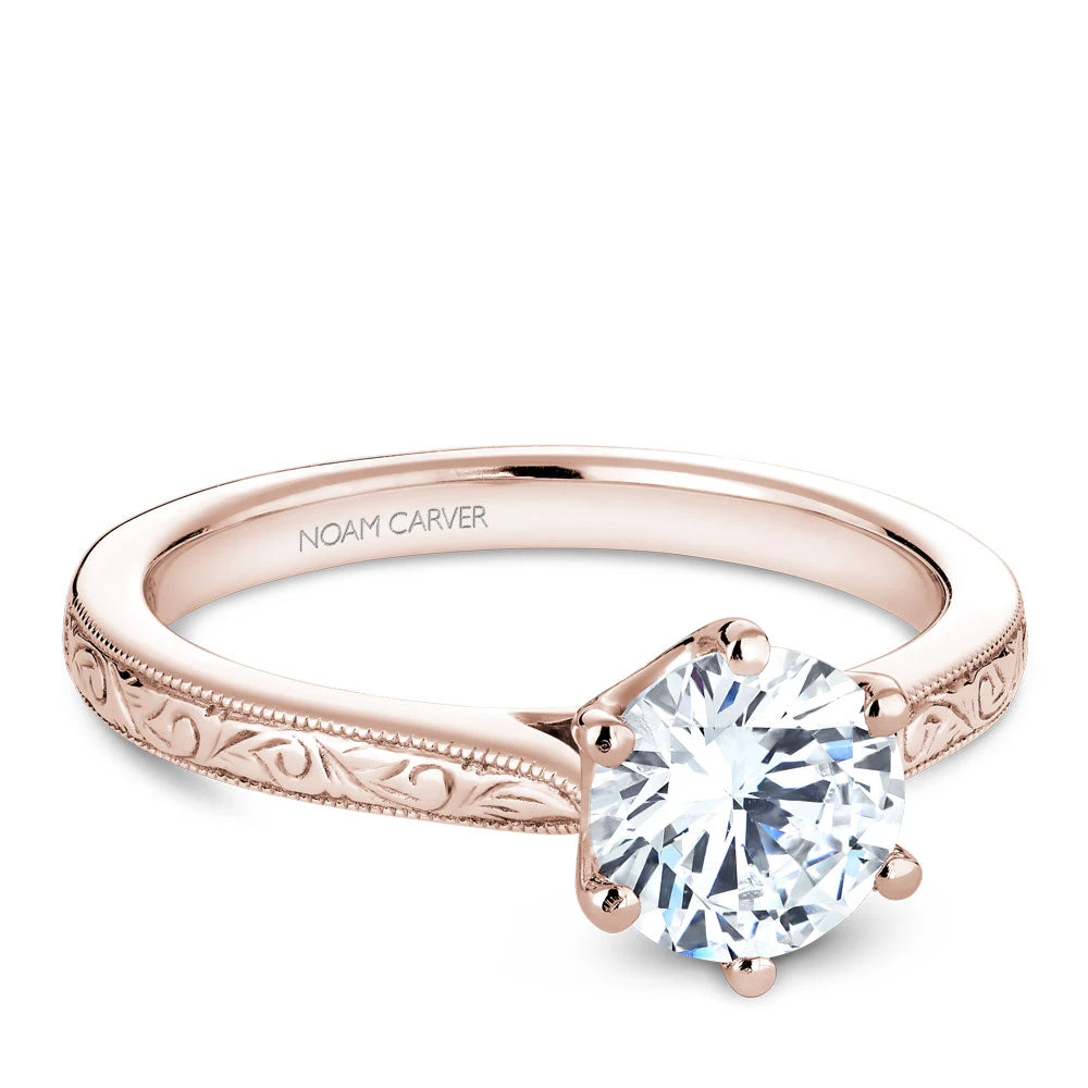A Noam Carver engraved rose gold engagement ring with 2 diamonds.