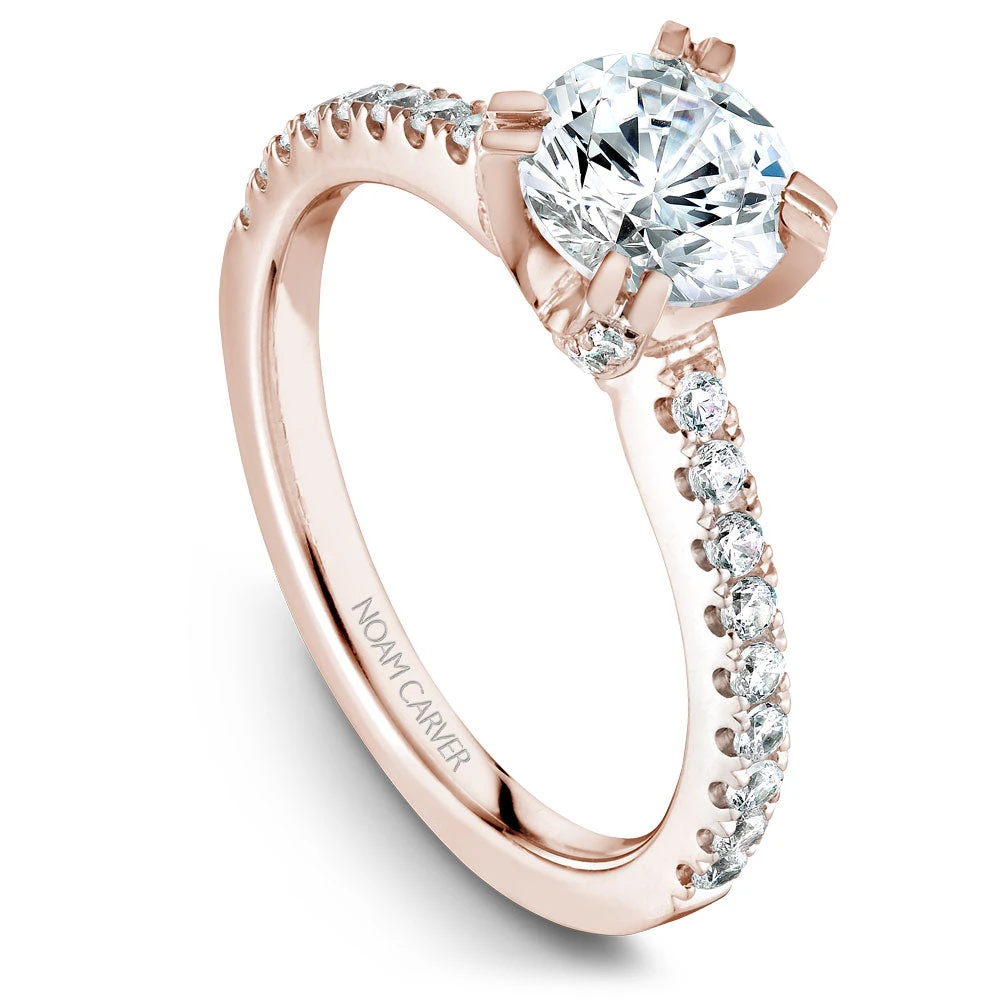 A Noam Carver rose gold engagement ring with 44 diamonds. Has a matching diamond curved band in rose gold.