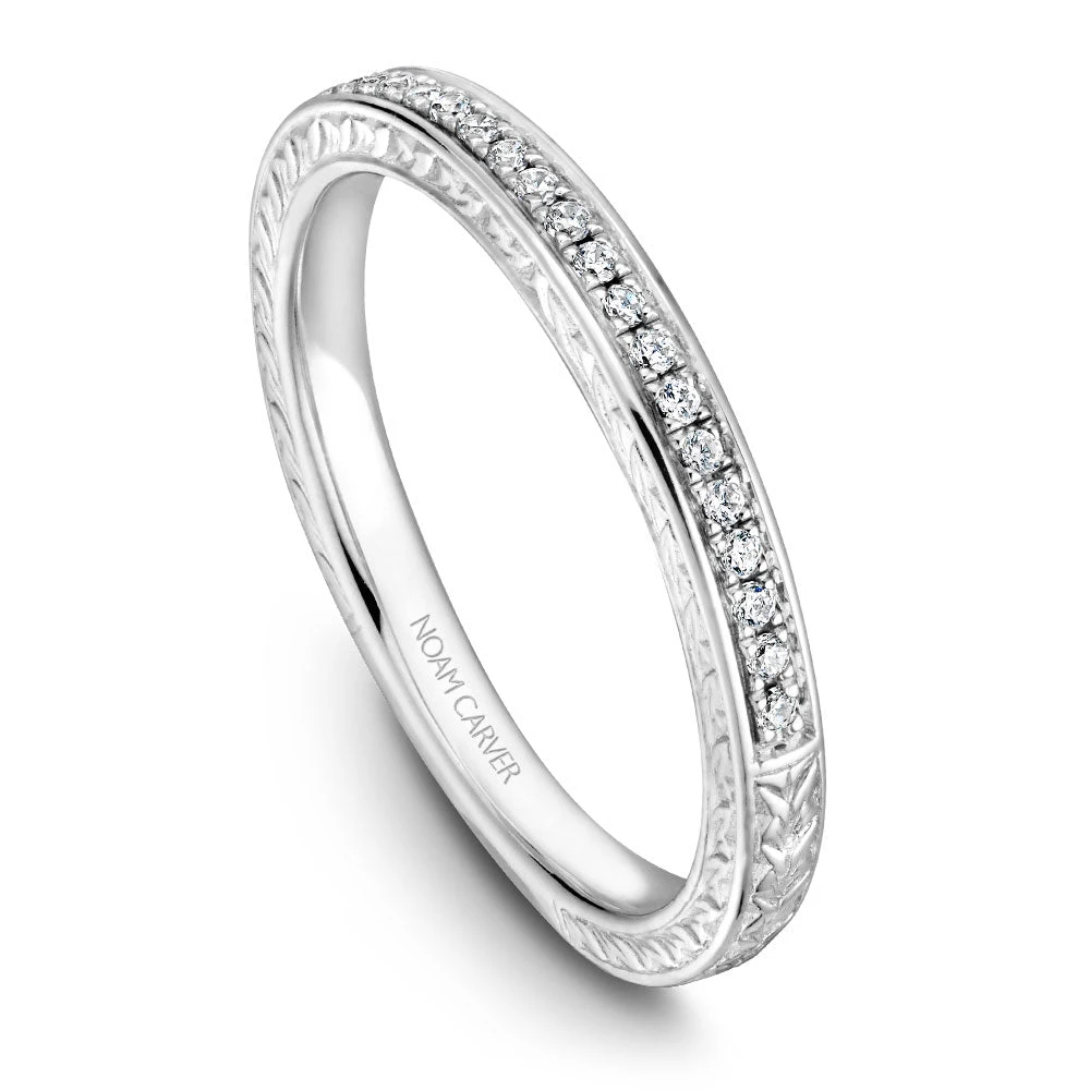 A Noam Carver engraved white gold engagement ring with 12 diamonds and a halo.