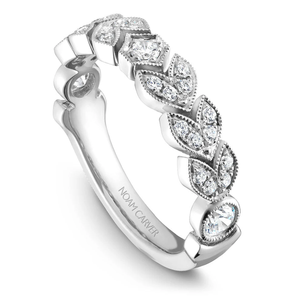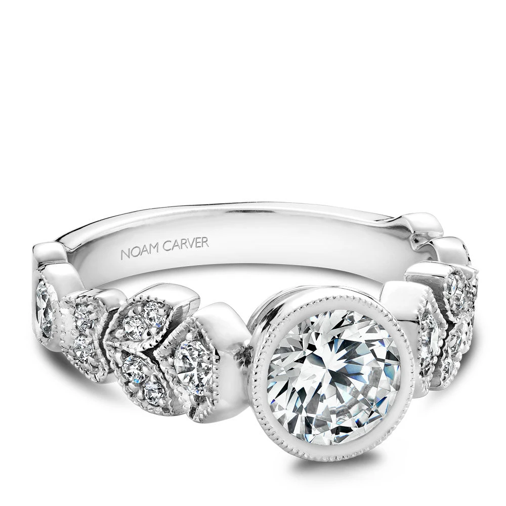 A Noam Carver white gold engagement ring with a round centerpiece and 16 round diamonds on a detailed floral band.