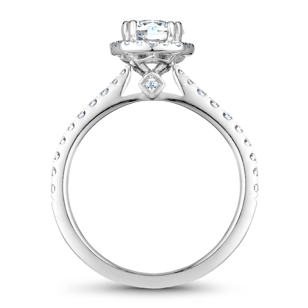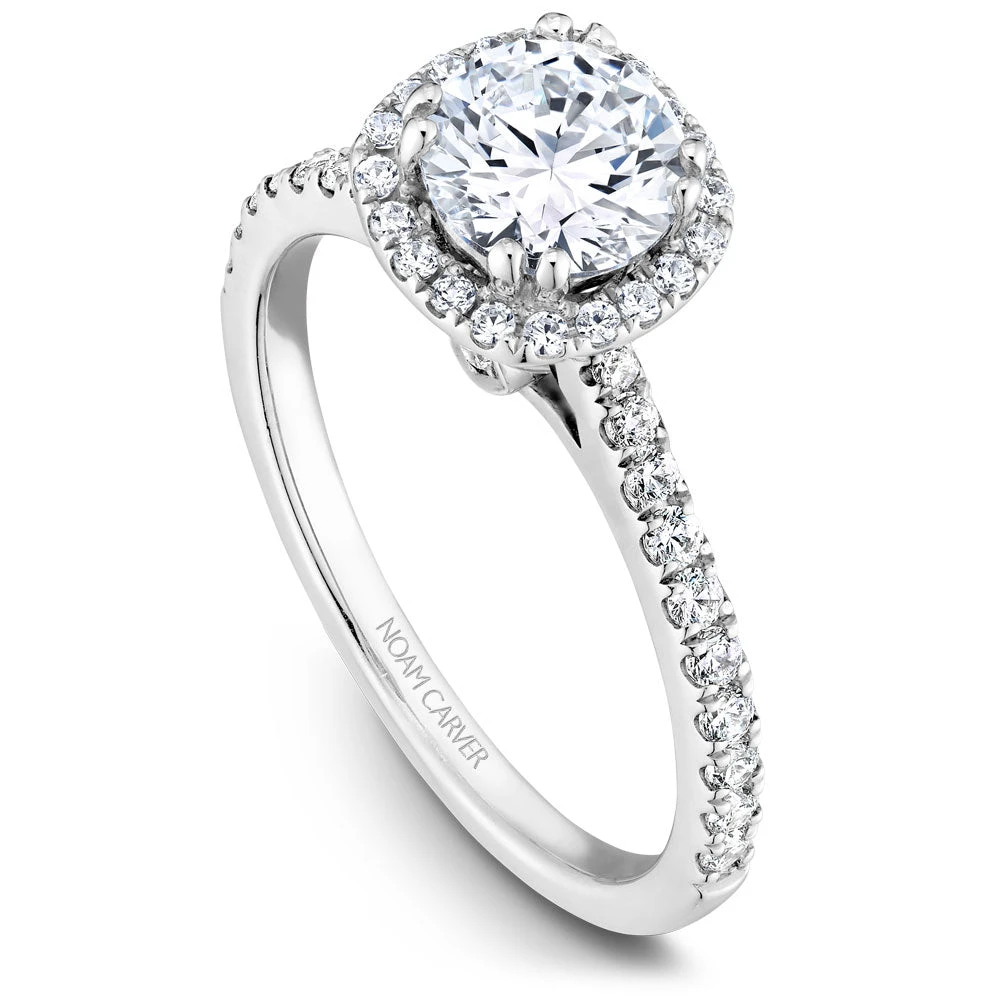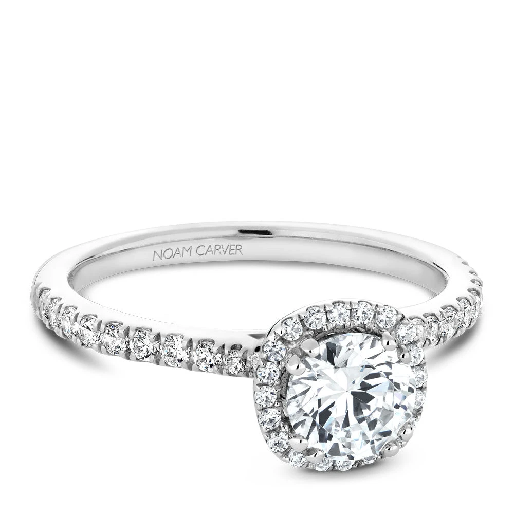 A Noam Carver white gold engagement ring with 42 diamonds and a round halo.