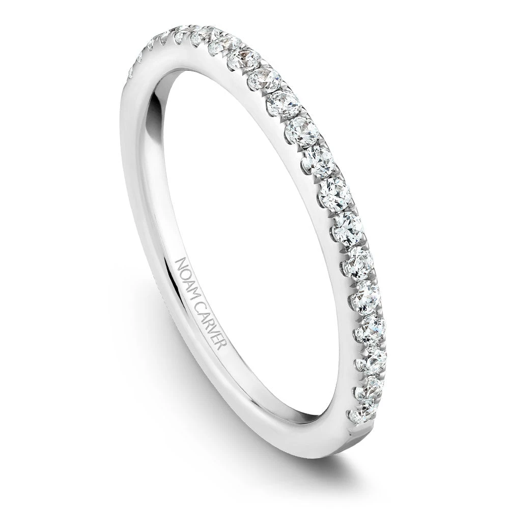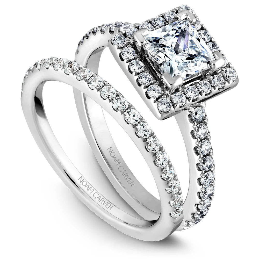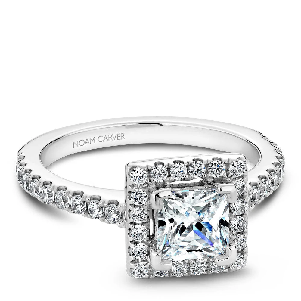 A Noam Carver white gold engagement ring with 38 diamonds, a princess cut centerpiece and a square halo.