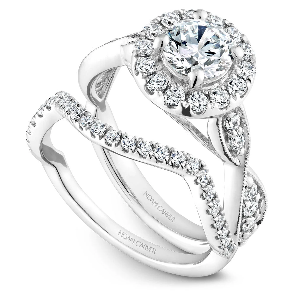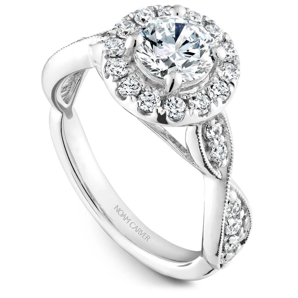 A Noam Carver white gold engagement ring with a floral halo and 26 diamonds.