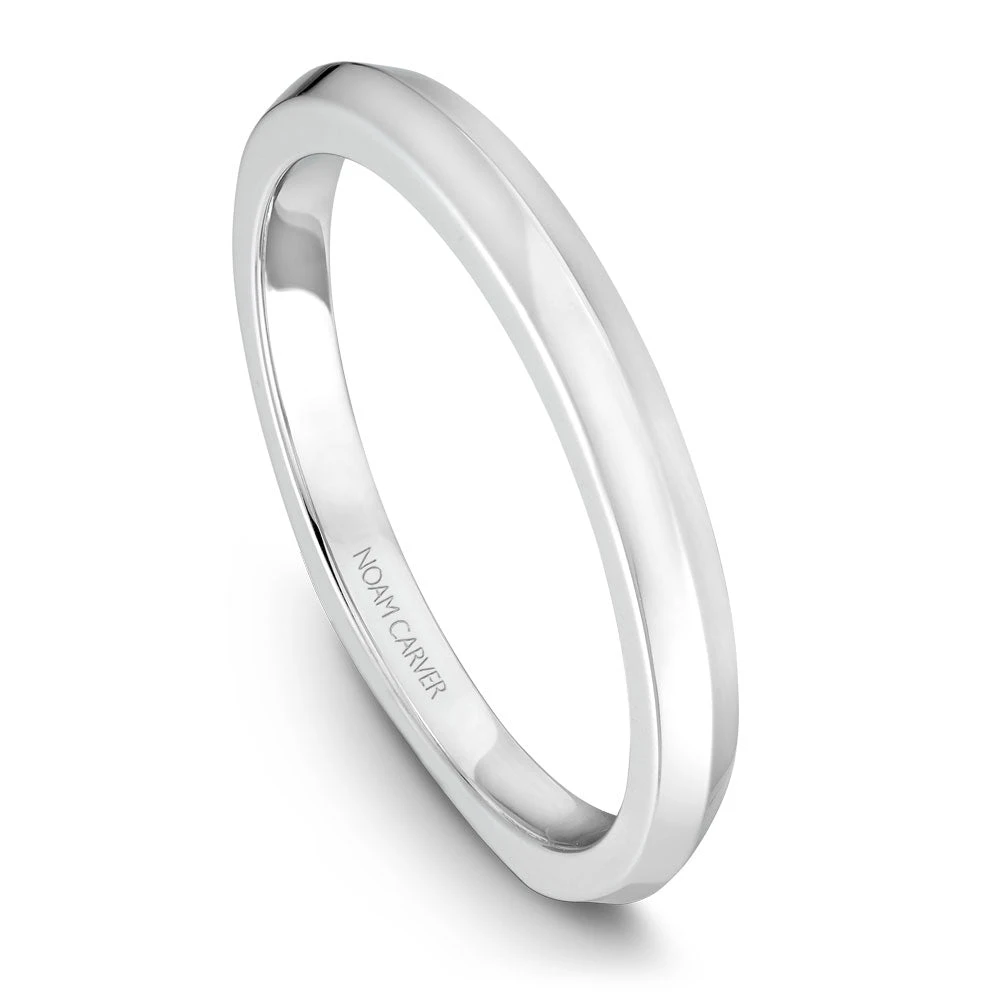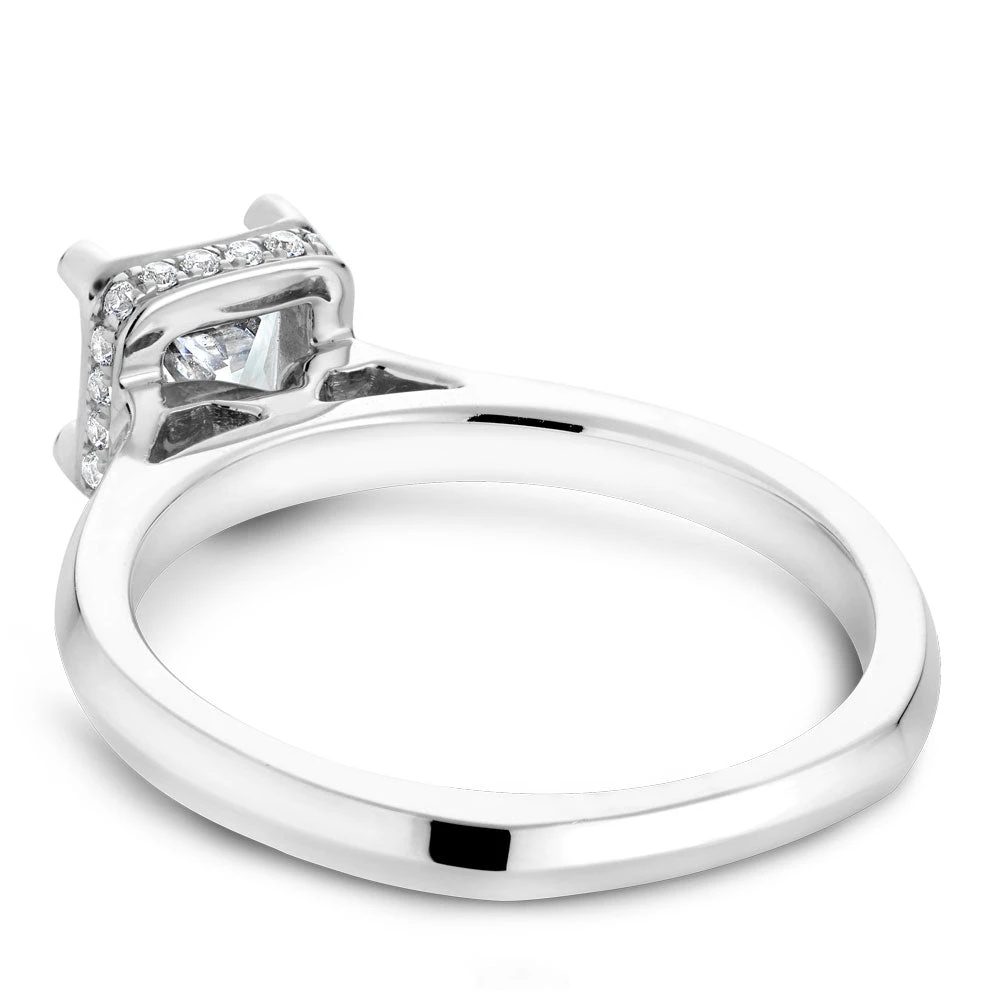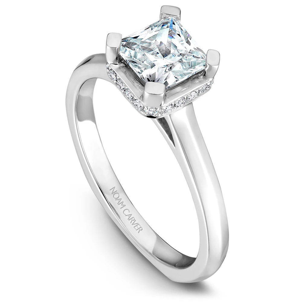 A Noam Carver white gold engagement ring with a princess cut centerpiece and 20 diamonds.