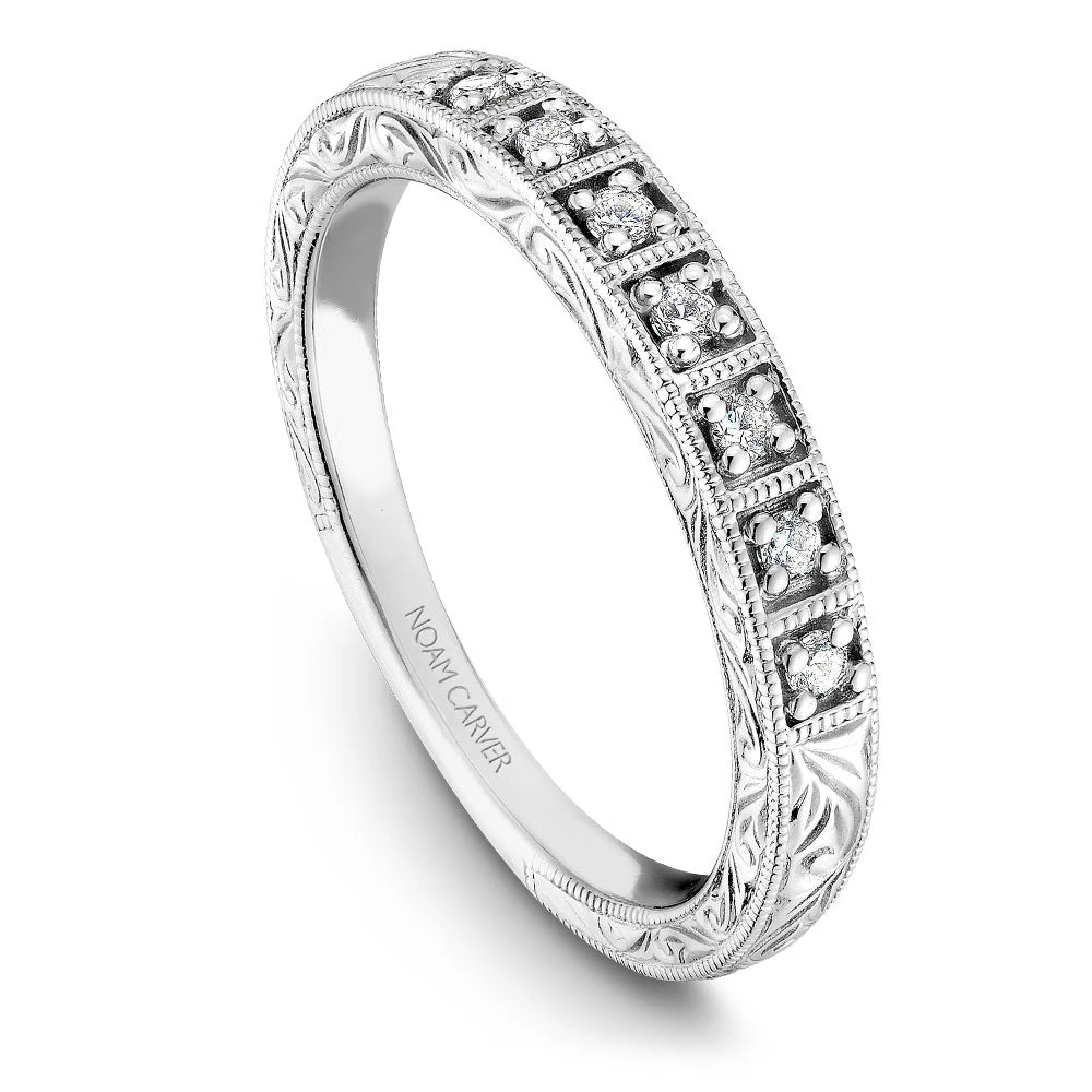 A Noam Carver engraved white gold engagement ring with 6 round diamonds on a band.