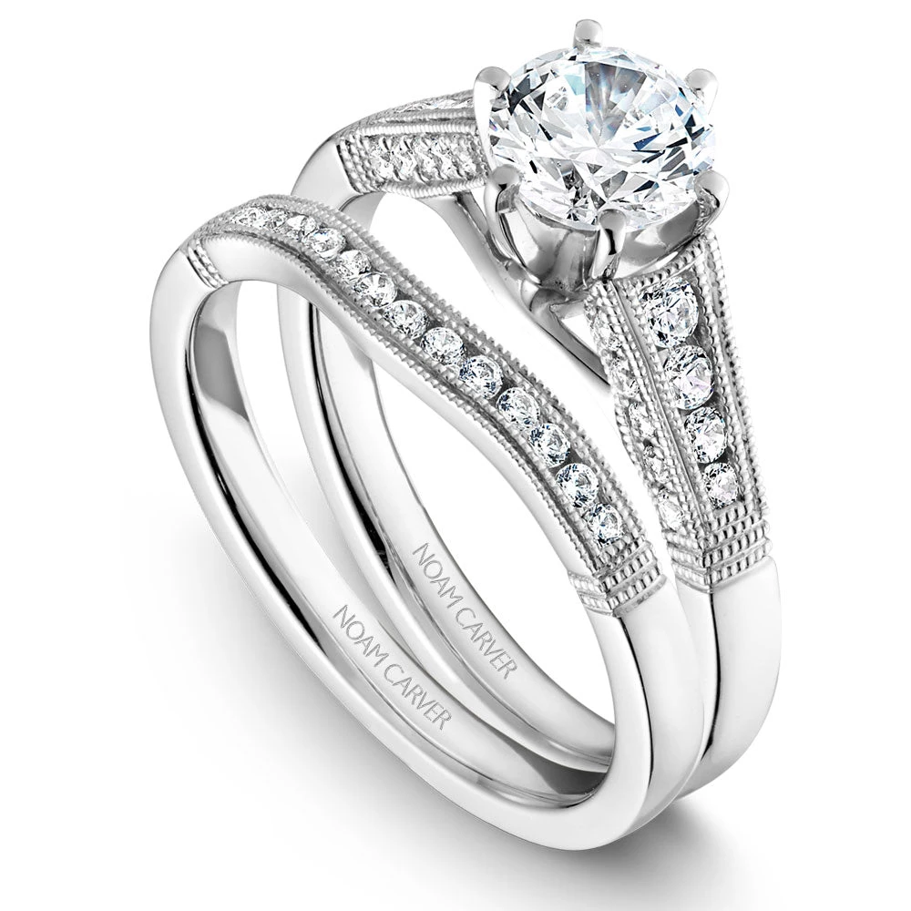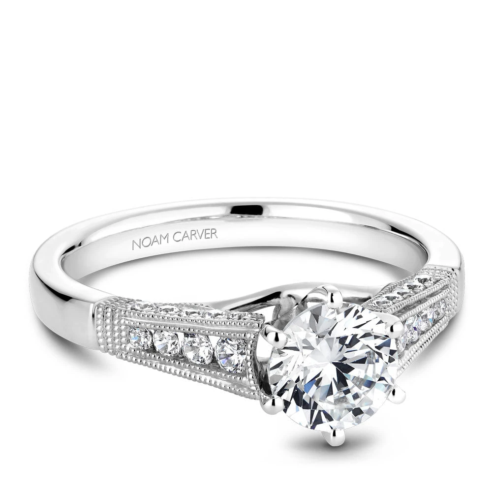 A Noam Carver white gold engagement ring with milgrain detailing and 28 round diamonds on a band.
