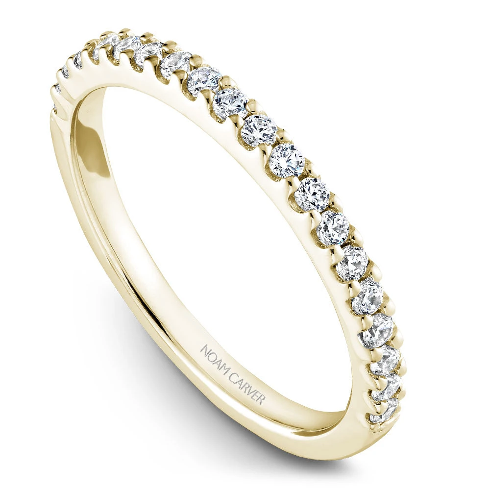 A Noam Carver yellow gold engagement ring with 14 diamonds.