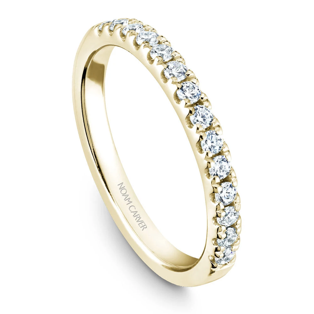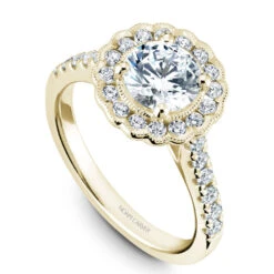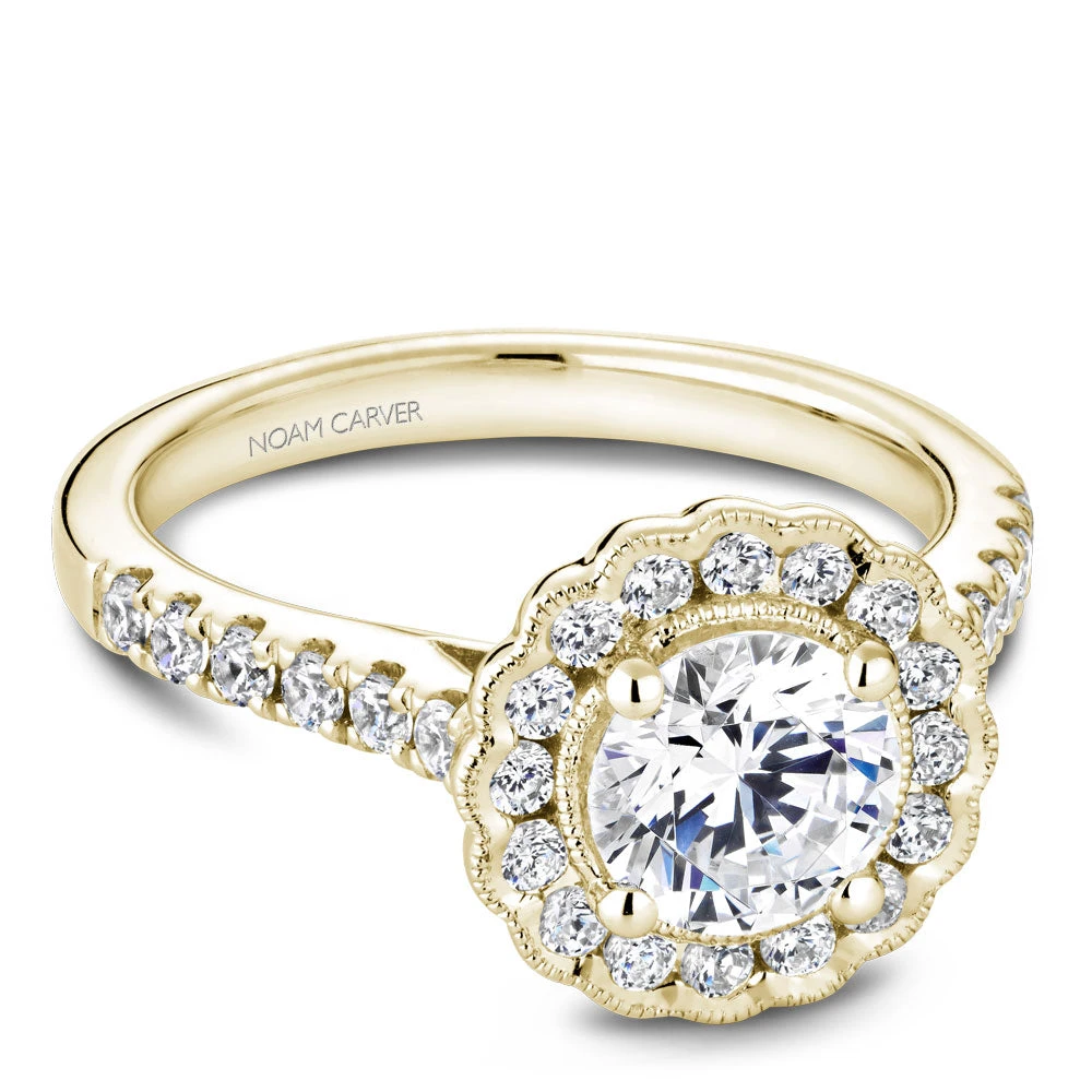 A Noam Carver yellow gold engagement ring with a floral halo and 34 diamonds.