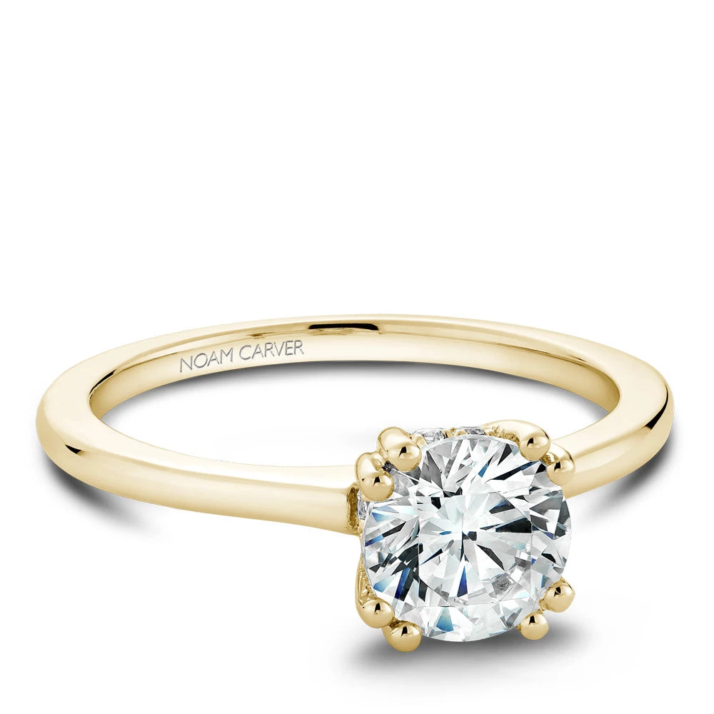 A Noam Carver yellow gold engagement ring with a round centerpiece and 8 diamonds.