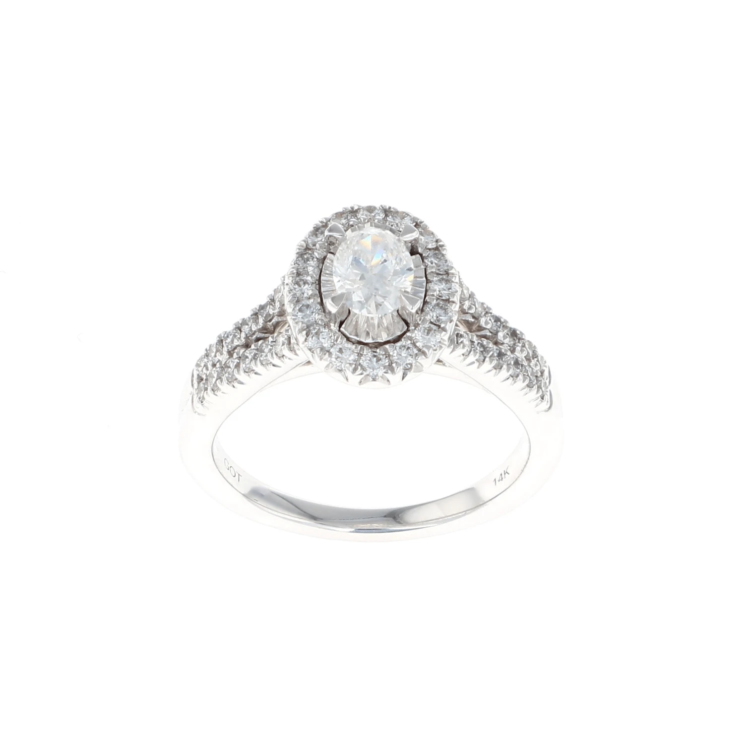 This engagement ring features a illusion set oval 0.50CTW shaped center diamond with a halo and 1/2 way split shank semi mount in 14K white gold.