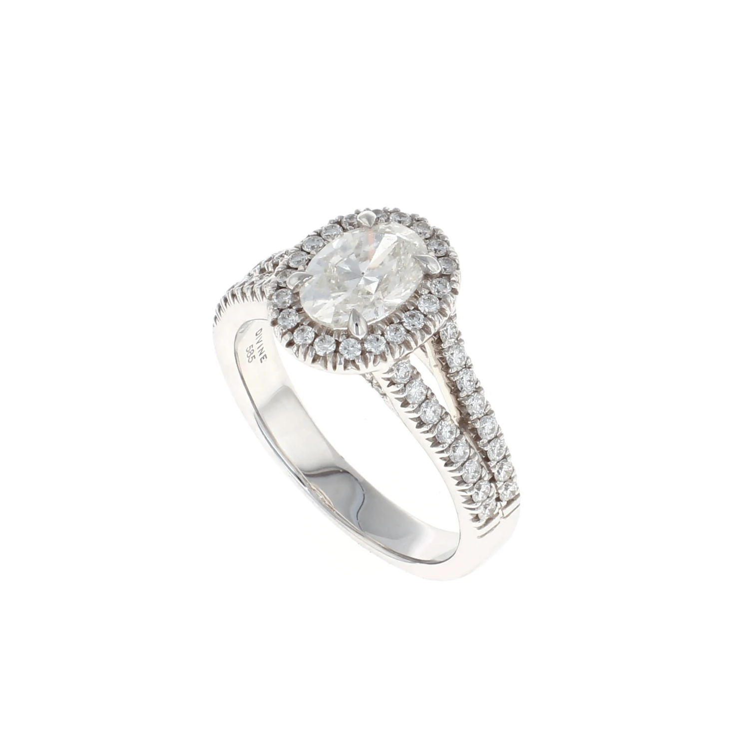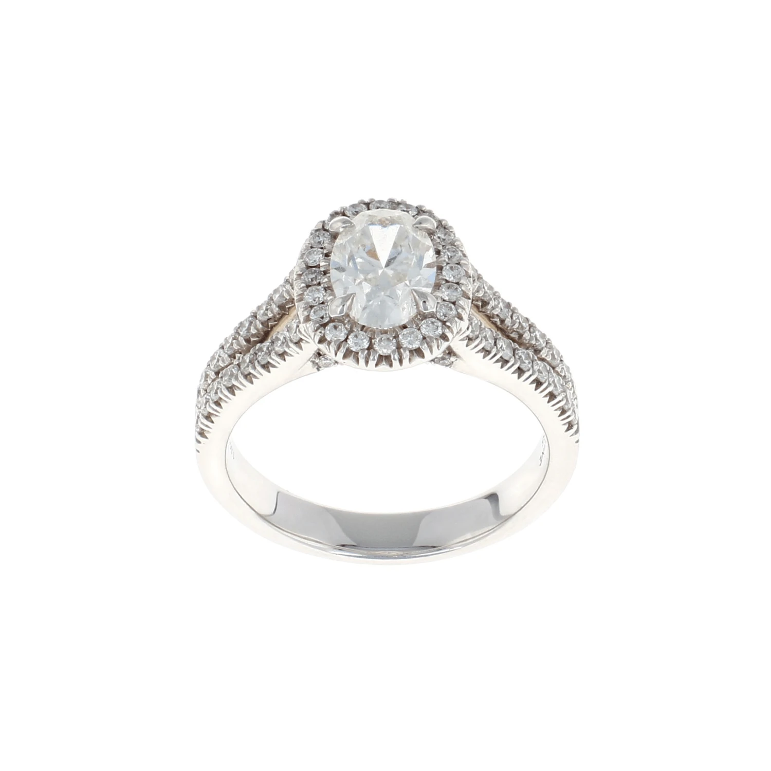 This beautiful Halo Complete engagement ring with a sparkling 1.01CTW Oval Center stone and a split shank 1/2 Way pave semi mount set in 14K White Gold is a romantic way to ask, “Will you marry me?”