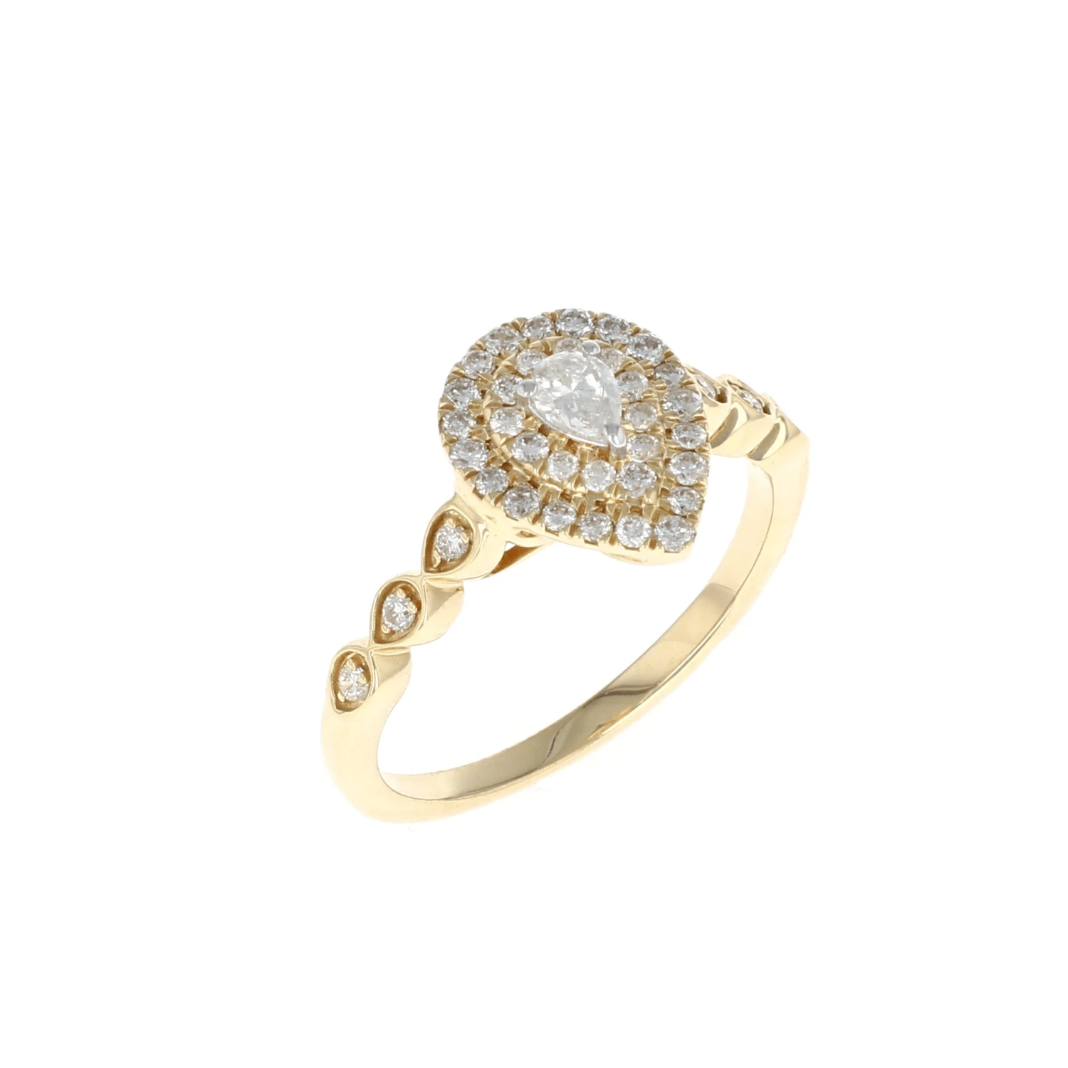 This complete engagement ring features a pear shaped center diamond with a double halo accented with beautiful stones on both sides of the ring set in 14K yellow gold. A beautiful way to say, “Will you marry me?”
