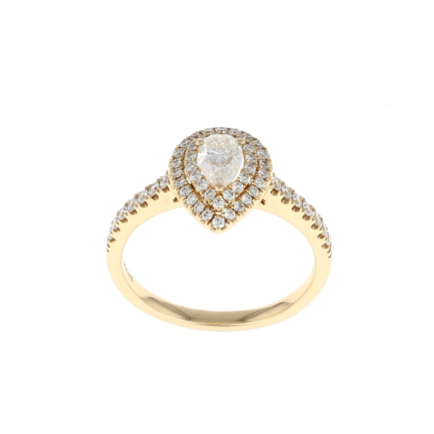 This complete engagement ring features a pear shaped center diamond with a double halo highlighted with a 1/2 semi mount set in 14K yellow gold. A beautiful way to say, “Will you marry me?”