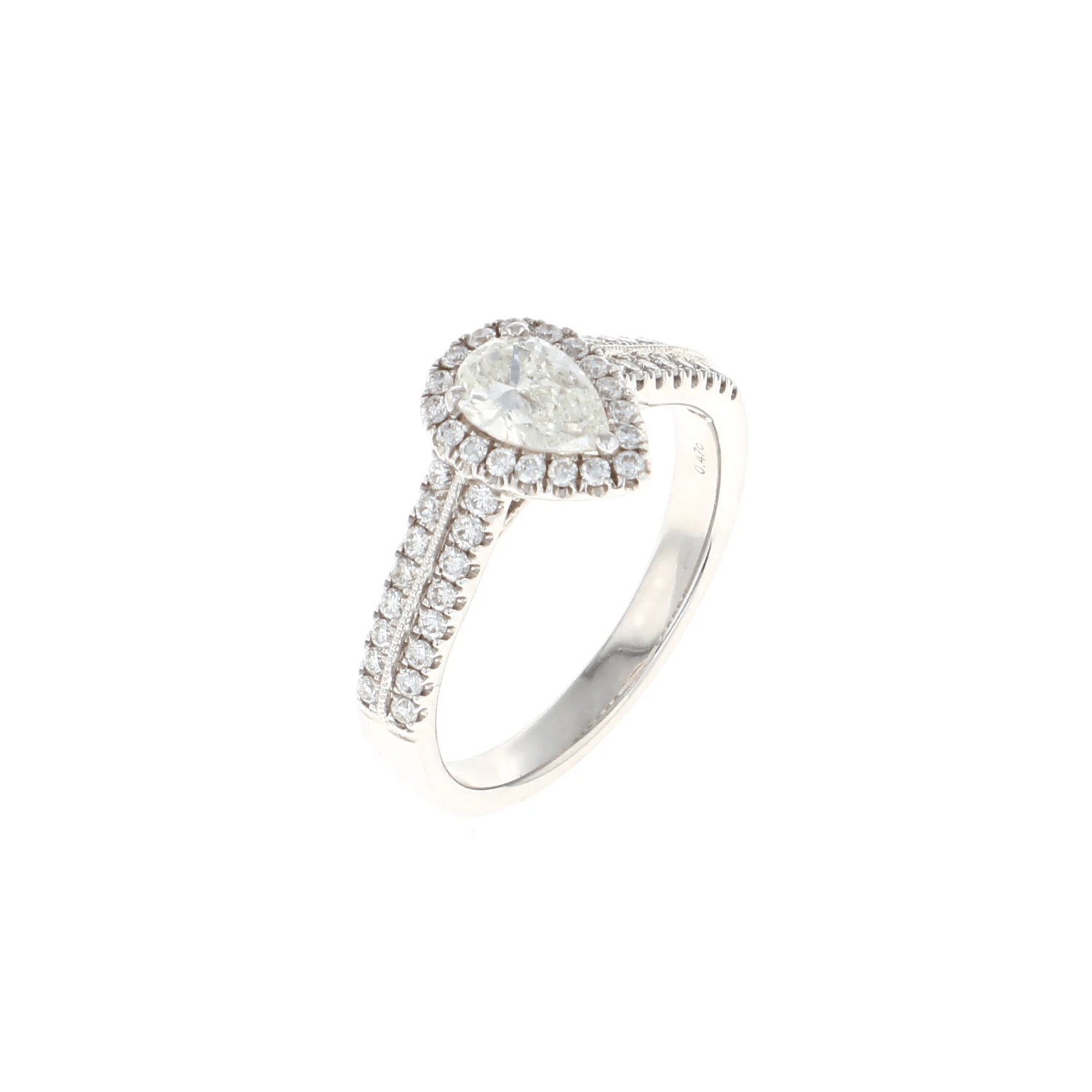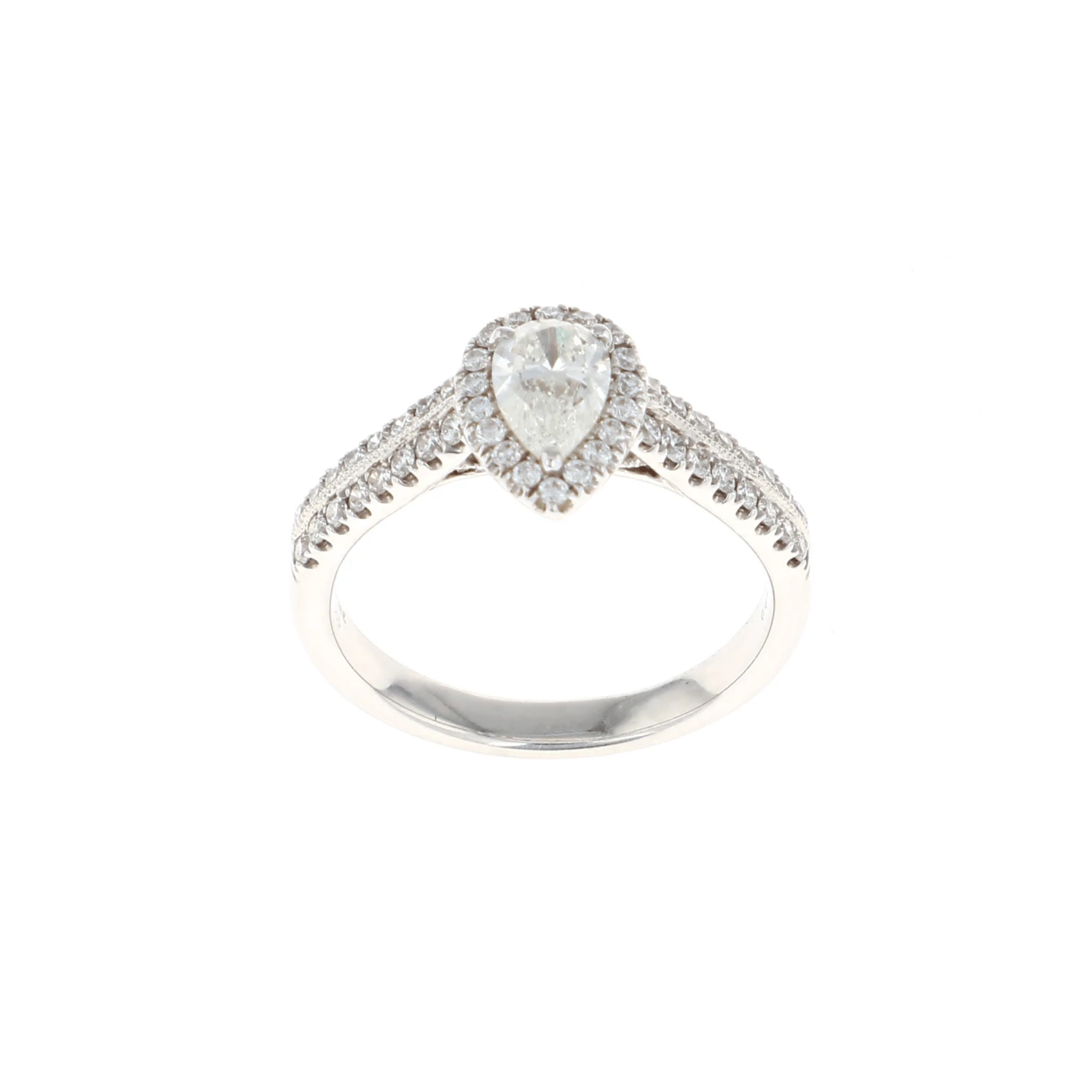 This engagement ring features a pear shaped center diamond with a halo and 1/2 way split shank pave semi mount set in 14K white gold.