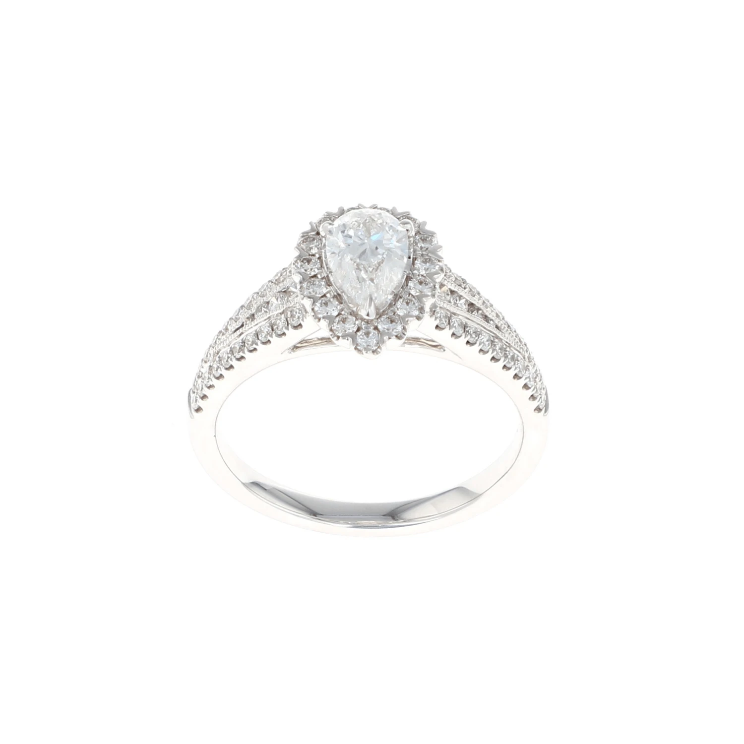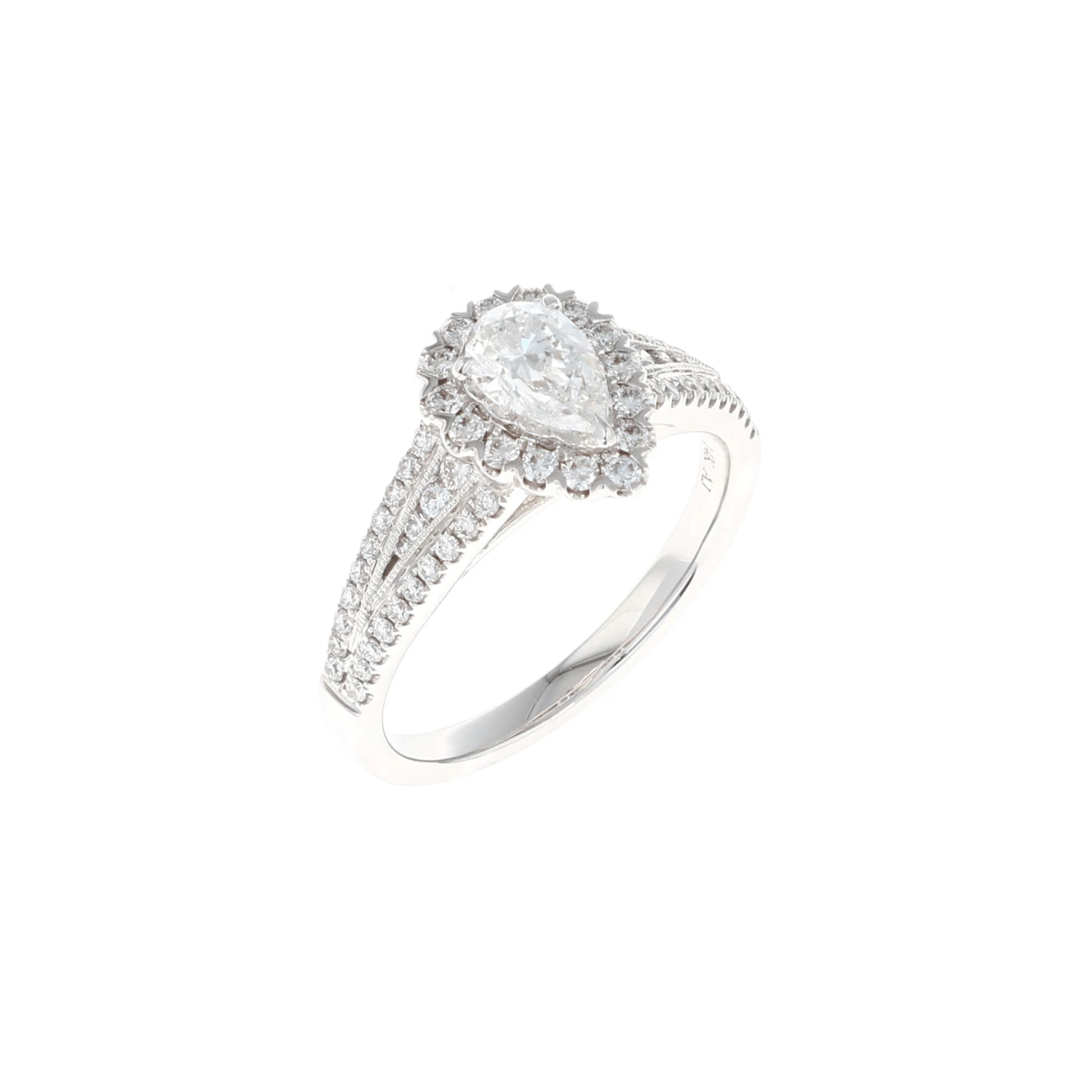 This engagement ring features a pear shaped (0.45CTW) center diamond with a halo and 1/2 way tapered milgrain semi mount set in 14K white gold.
