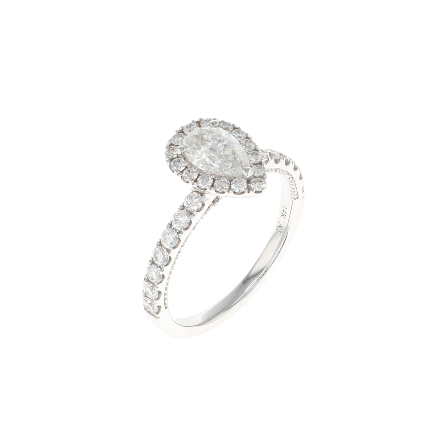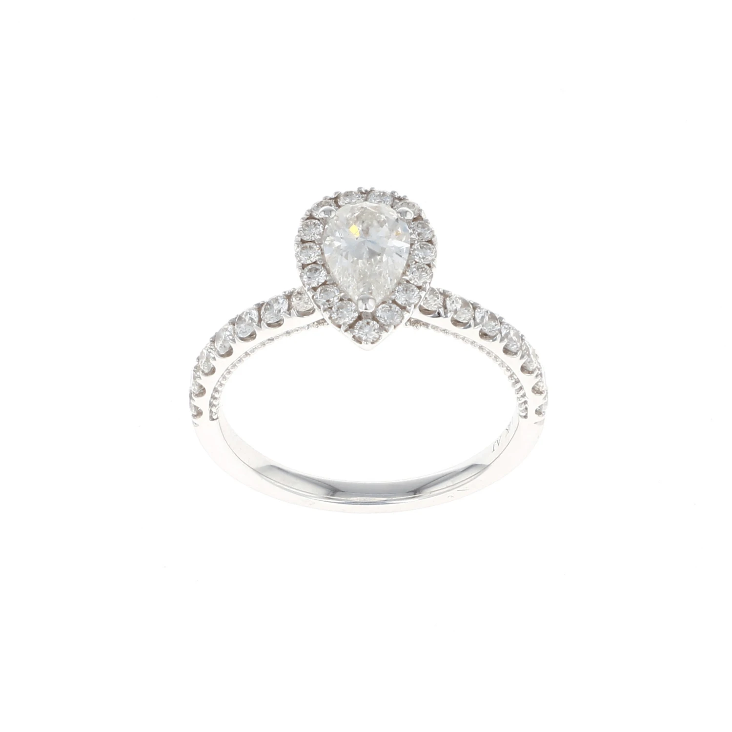 This engagement ring features a pear shaped (0.75CTW) center diamond with a halo and 1/2 Way semi mount set in 14K white gold.